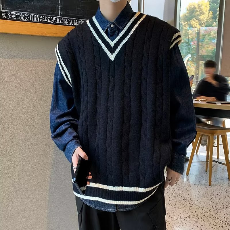 아메리칸 스타일 스웨터 조끼 남자의 가을과 겨울 Ins 패셔너블 루즈 V 넥 웨이슬 니트 일본 스타일 대학 스타일 조끼 스웨터