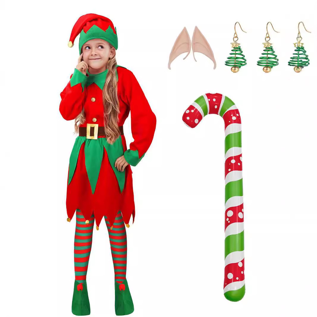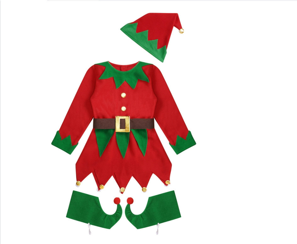 유럽과 미국의 국경 간 성인 크리스마스 의류 어린이 크리스마스 엘프 세트 레드 및 그린 컬러 코스 의류 성능 세트