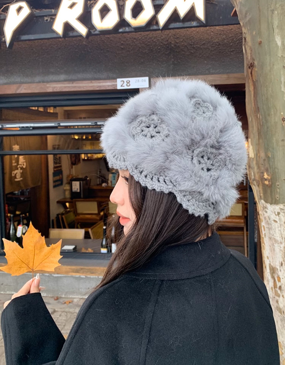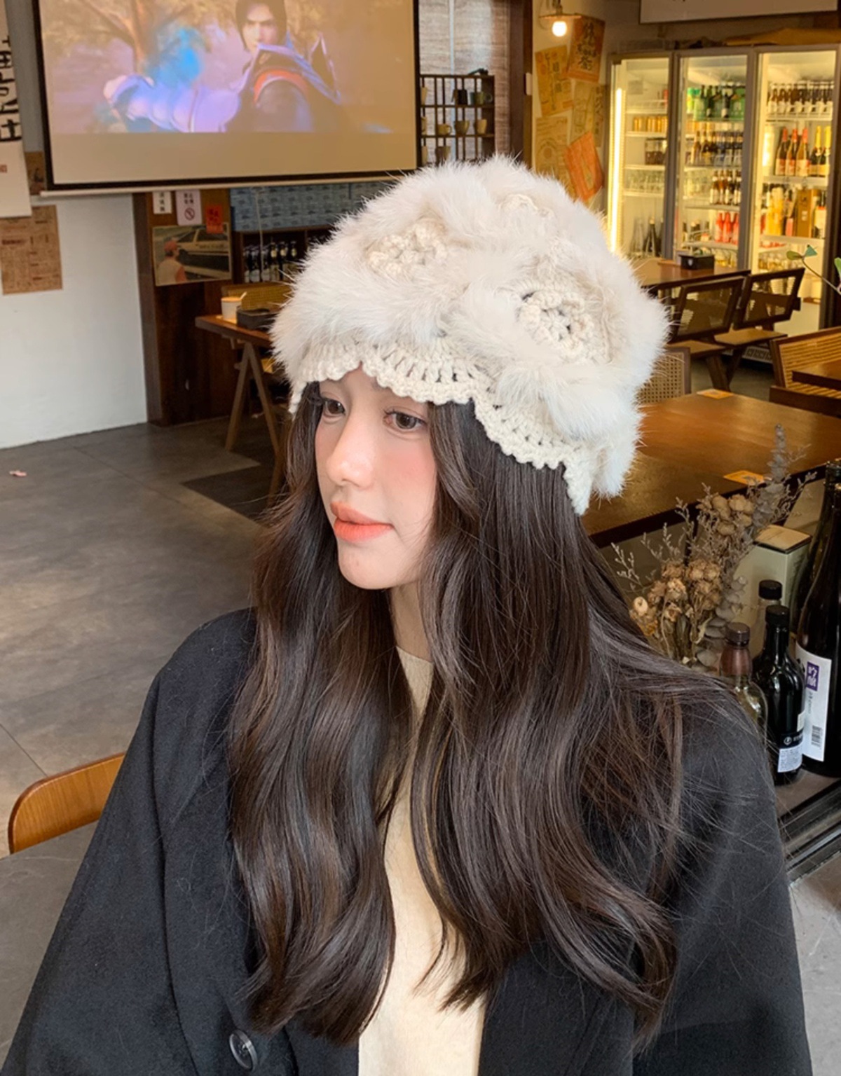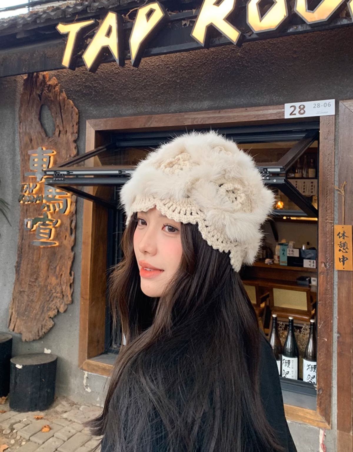 마오 마오 모자 진짜 모피 토끼 봉제 모피 모자 한국식 올매치 방한식 따뜻한 양모 니트 발가락 모자 여자 겨울스토어 가기