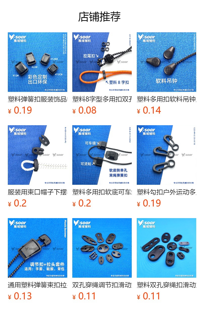 我厂成立于2005年,主营服装箱包辅料、各式塑胶扣具、五金钮扣、织带绳子、魔术贴等产品,是一家拥有模具开发、产品设计、专业生产设备一体化的企业,产品广泛运用,如:户外用品、服装箱包、配饰、医疗配件、文具等…