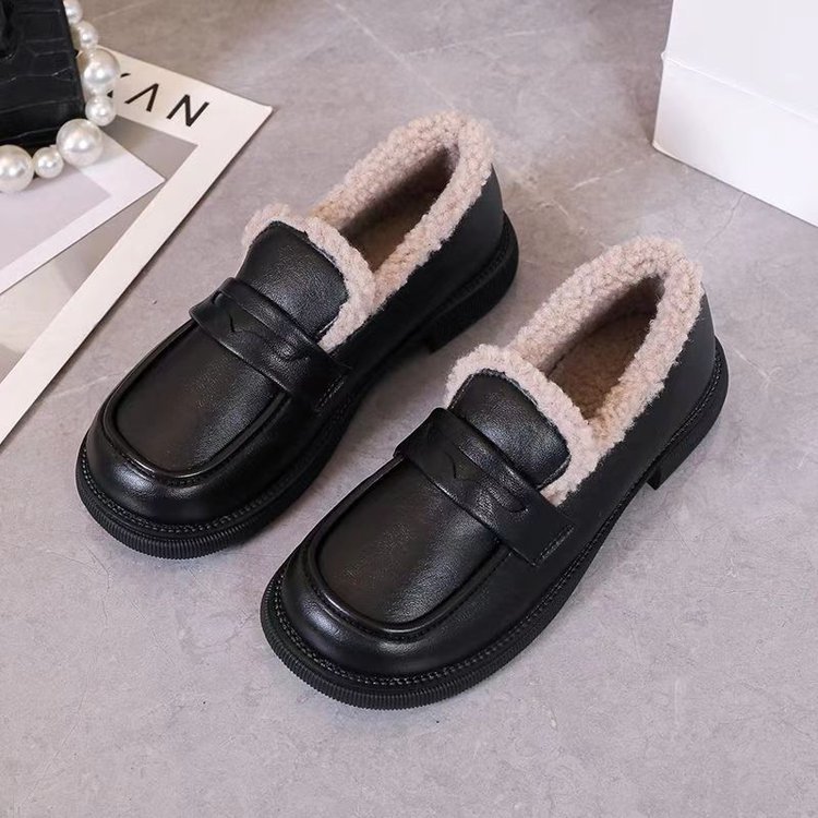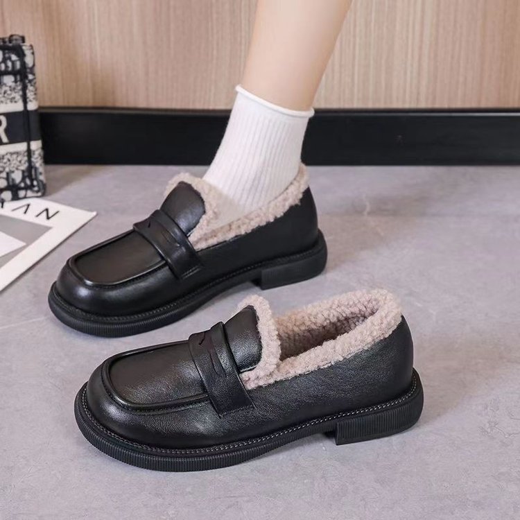 기모 로퍼 여성 2024 가을 및 겨울 새로운 영국 스타일 플랫 빈 신발 기모 두꺼운 마오 마오 신발 작은 가죽 신발스토어 가기