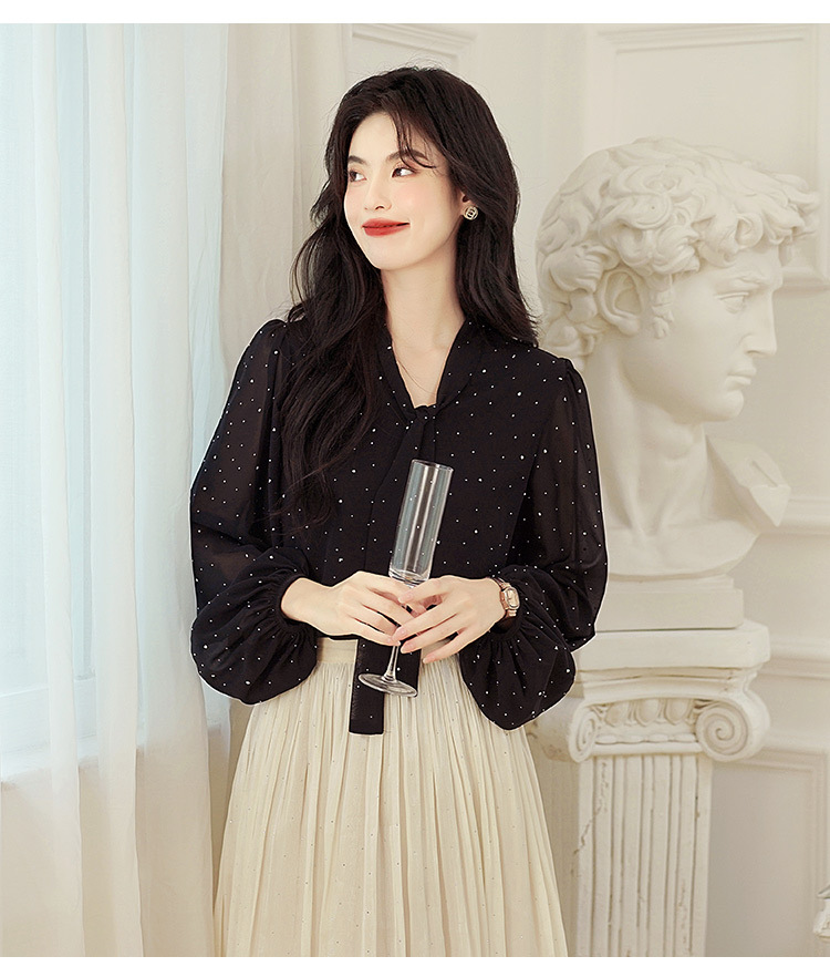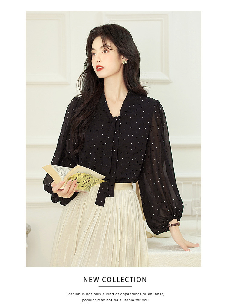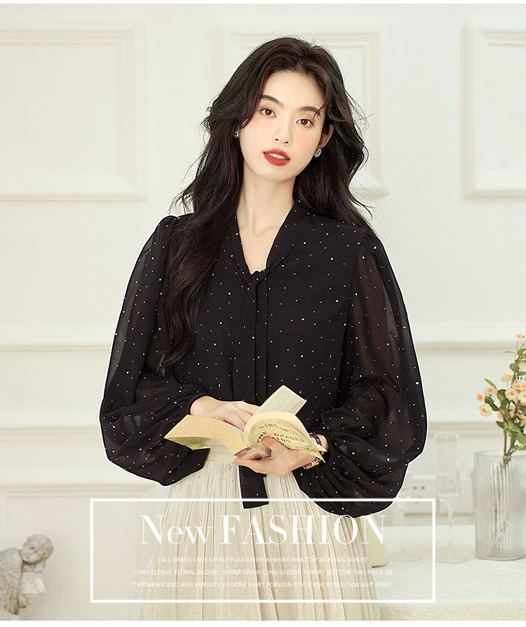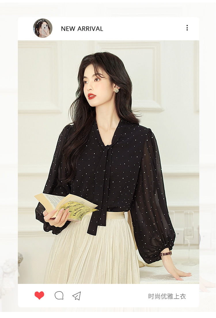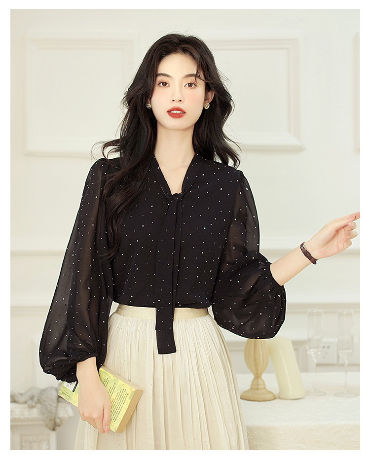 가을 2024 프랑스 레트로 스트랩 셔츠 최고 여성 기질 통근 디자인 감각 느슨한 긴 소매 쉬폰 셔츠