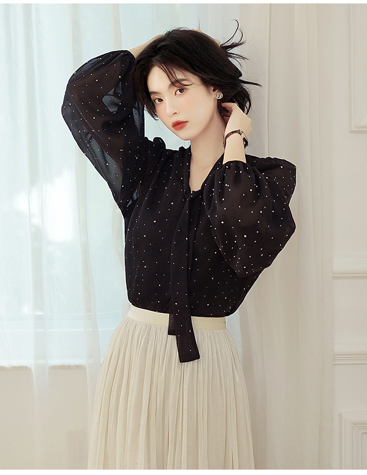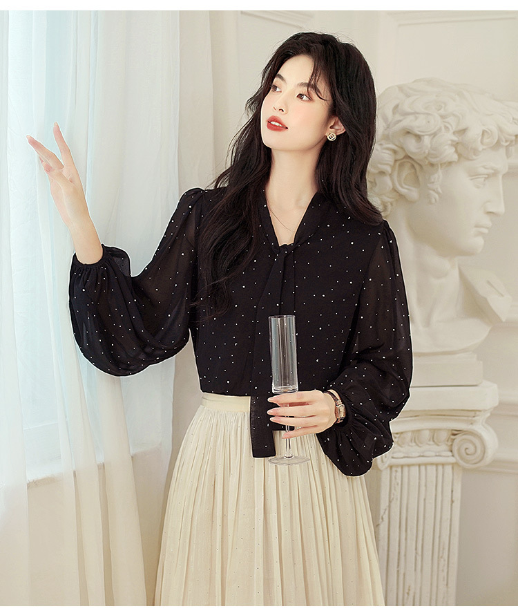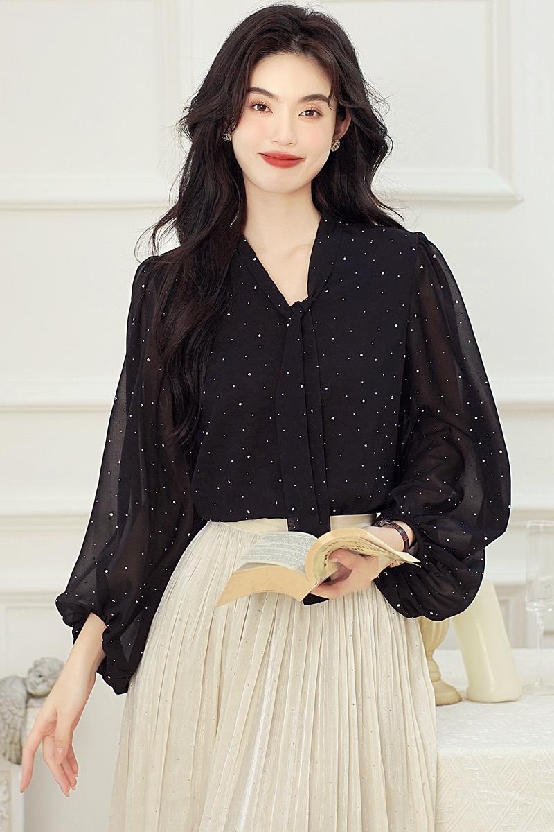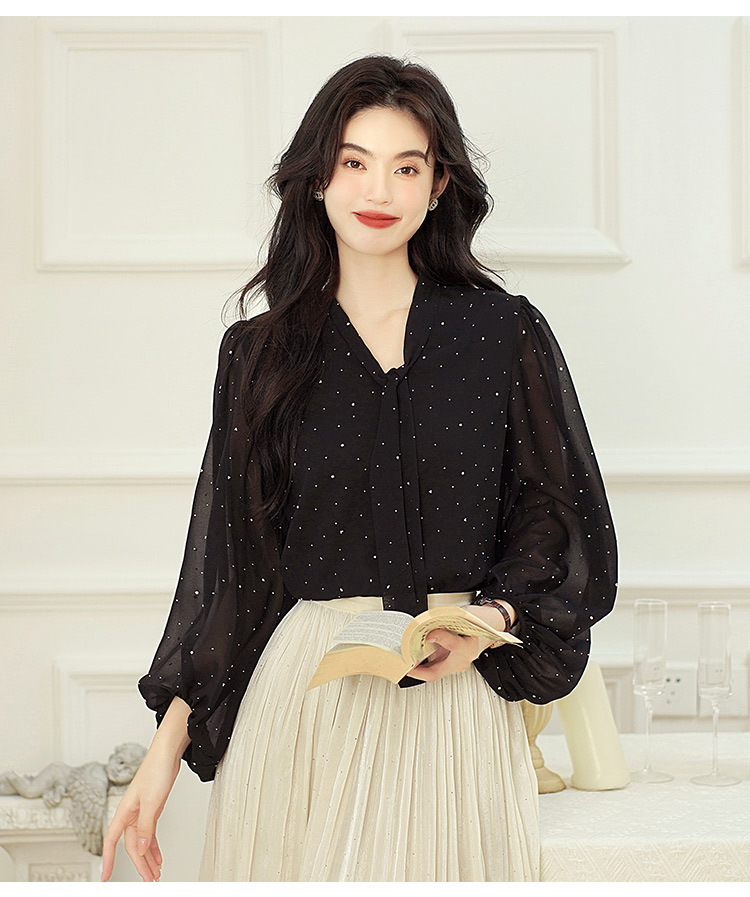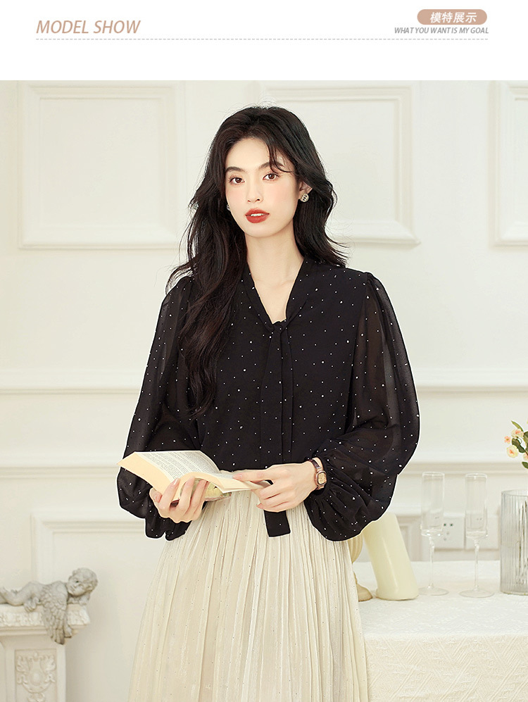 가을 2024 프랑스 레트로 스트랩 셔츠 최고 여성 기질 통근 디자인 감각 느슨한 긴 소매 쉬폰 셔츠