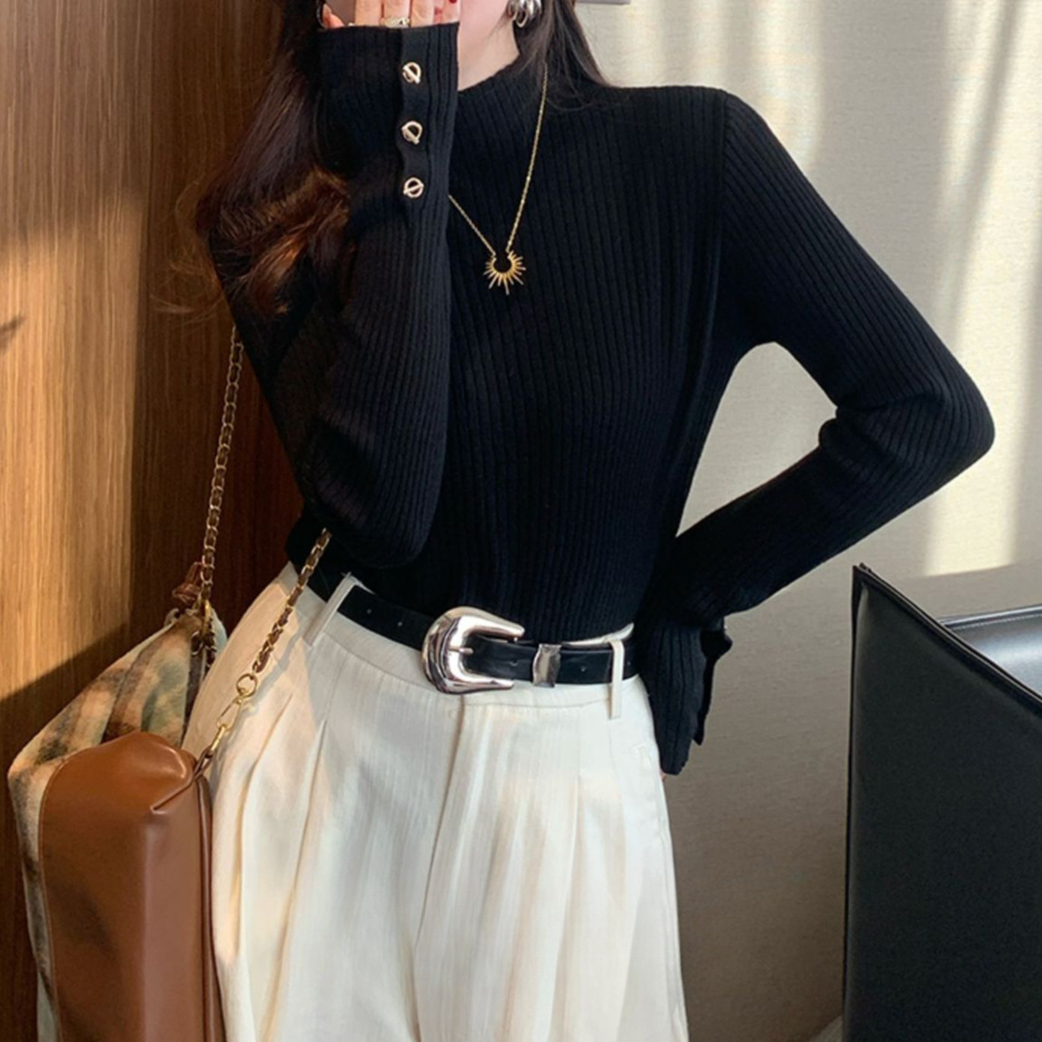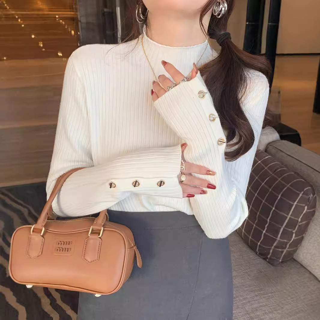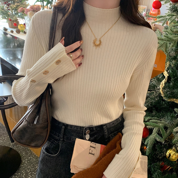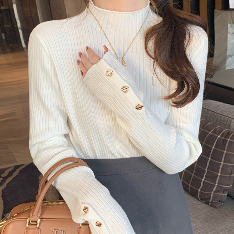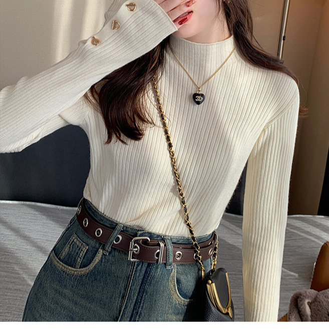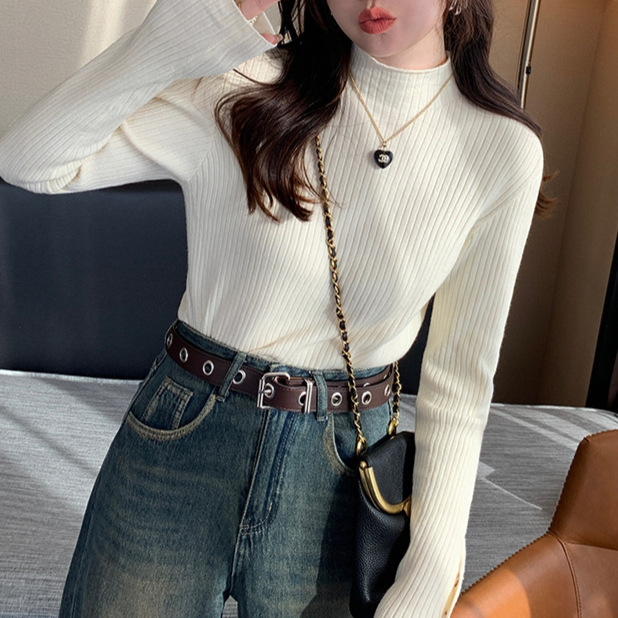 하프 터틀넥베이스 셔츠 여성의 봄과 가을 새로운 도착 웨스턴 스타일 화이트 내부 이른 가을 스웨터 디자인 센스 니치 니트 탑