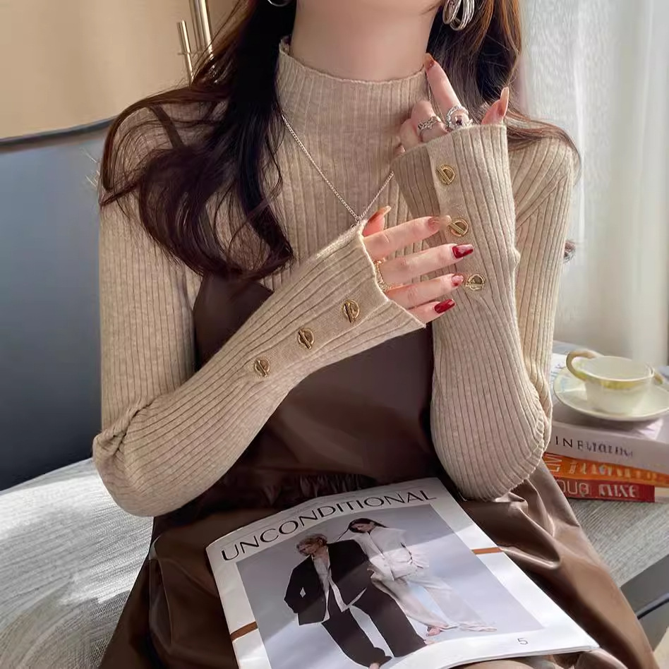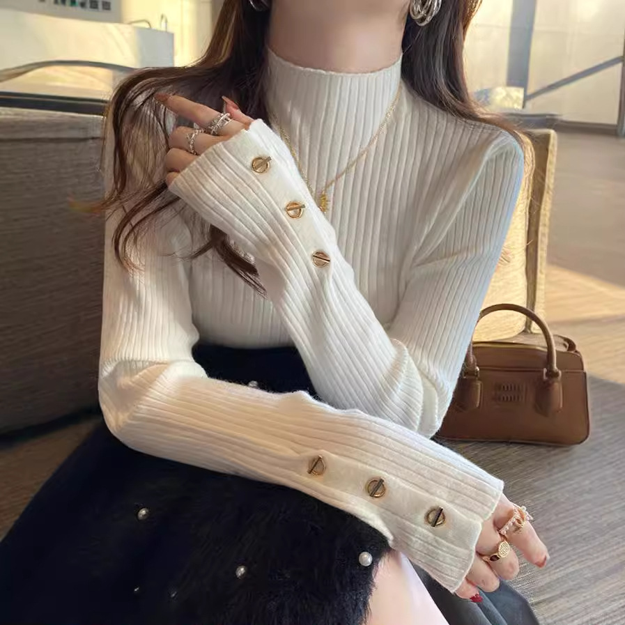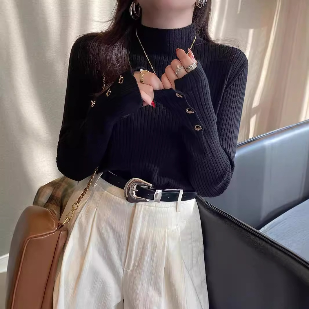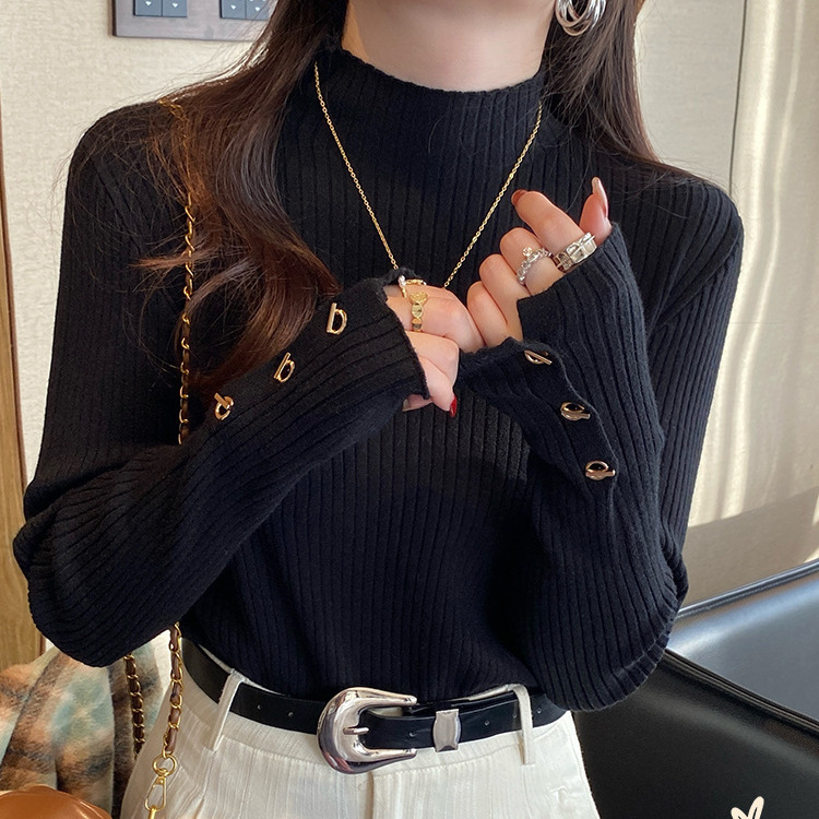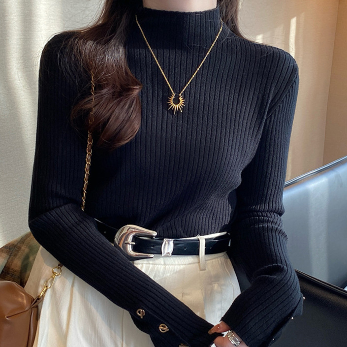 하프 터틀넥베이스 셔츠 여성의 봄과 가을 새로운 도착 웨스턴 스타일 화이트 내부 이른 가을 스웨터 디자인 센스 니치 니트 탑