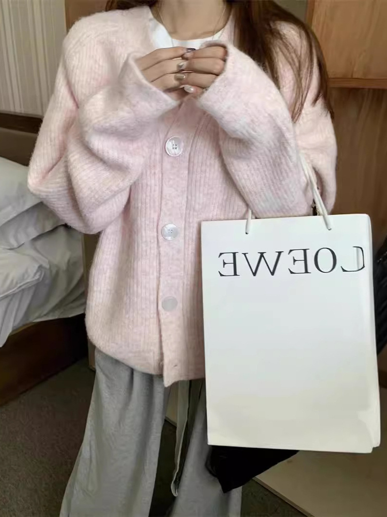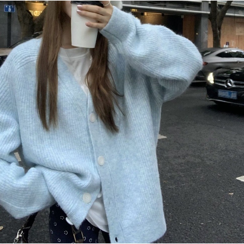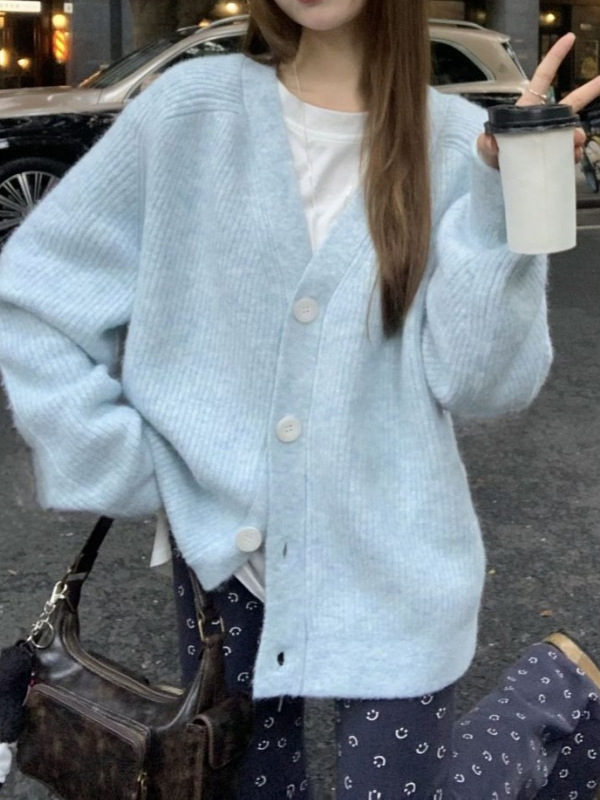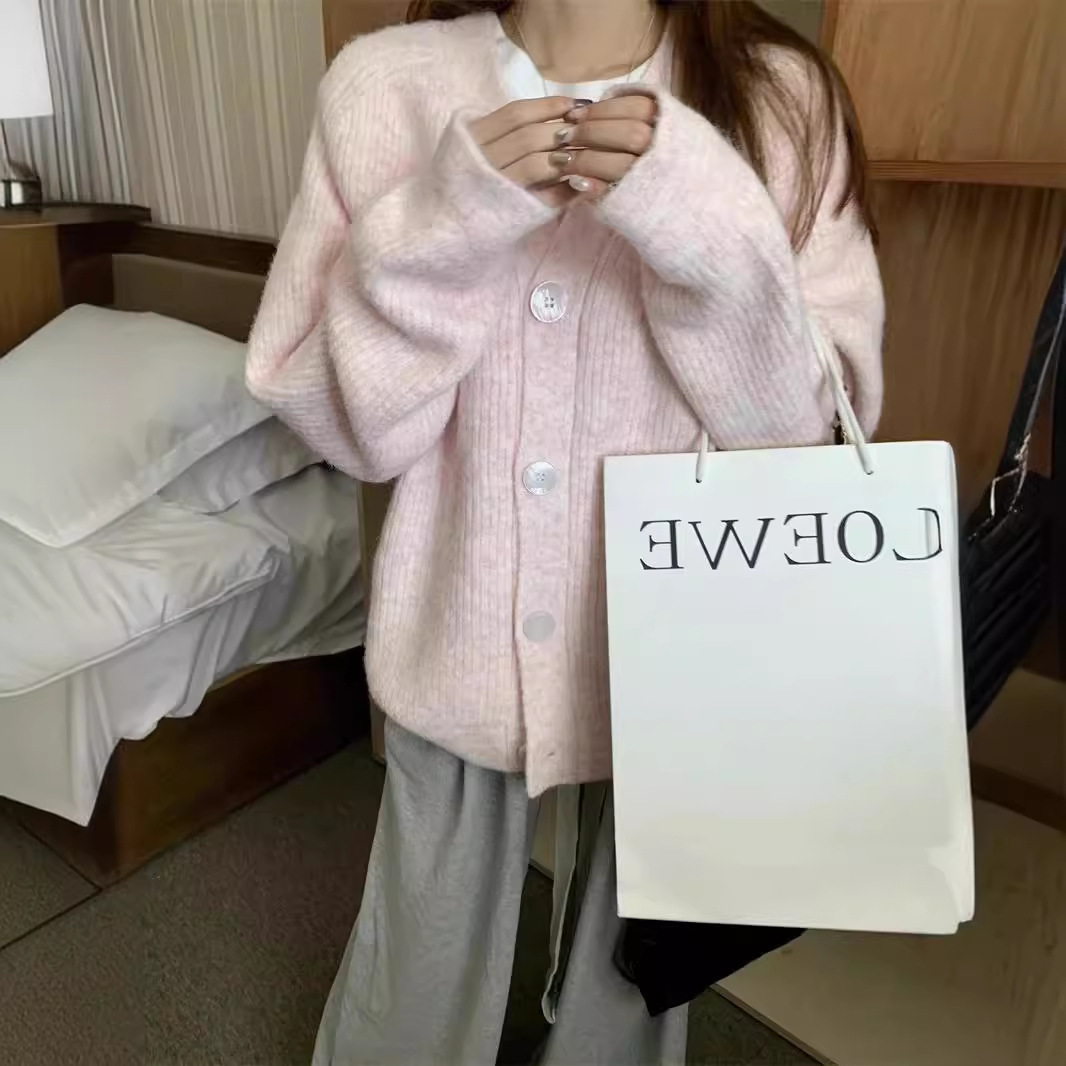 달콤한 스타일 V-넥 루즈 니트 스웨터 카디건 여성 24 년 가을/겨울 소프트 왁스 솔리드 컬러 게으른 스웨터 코트 재킷