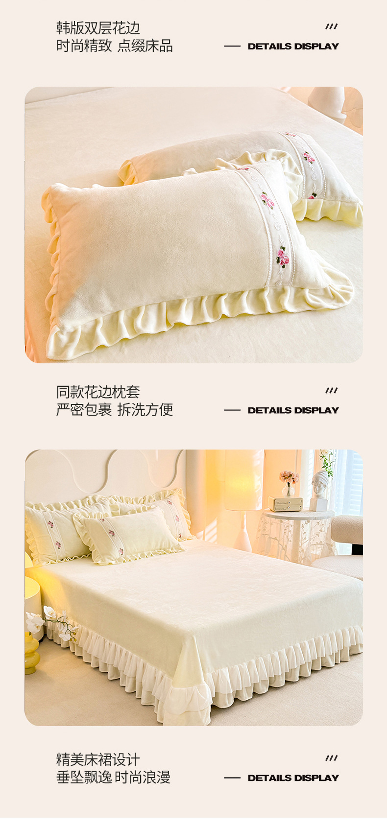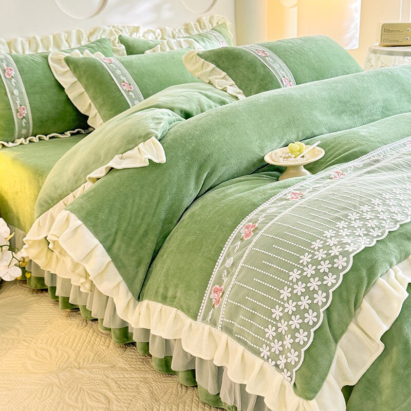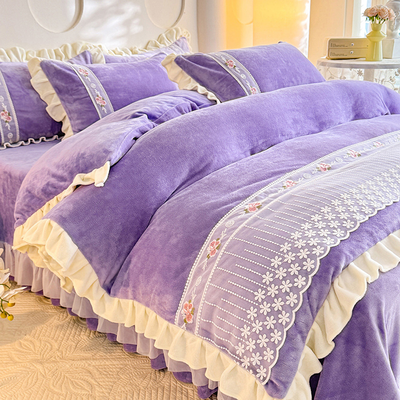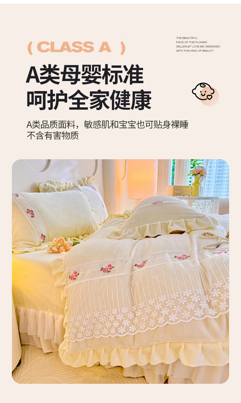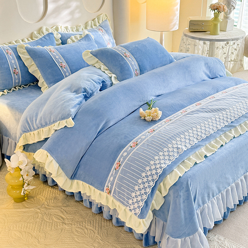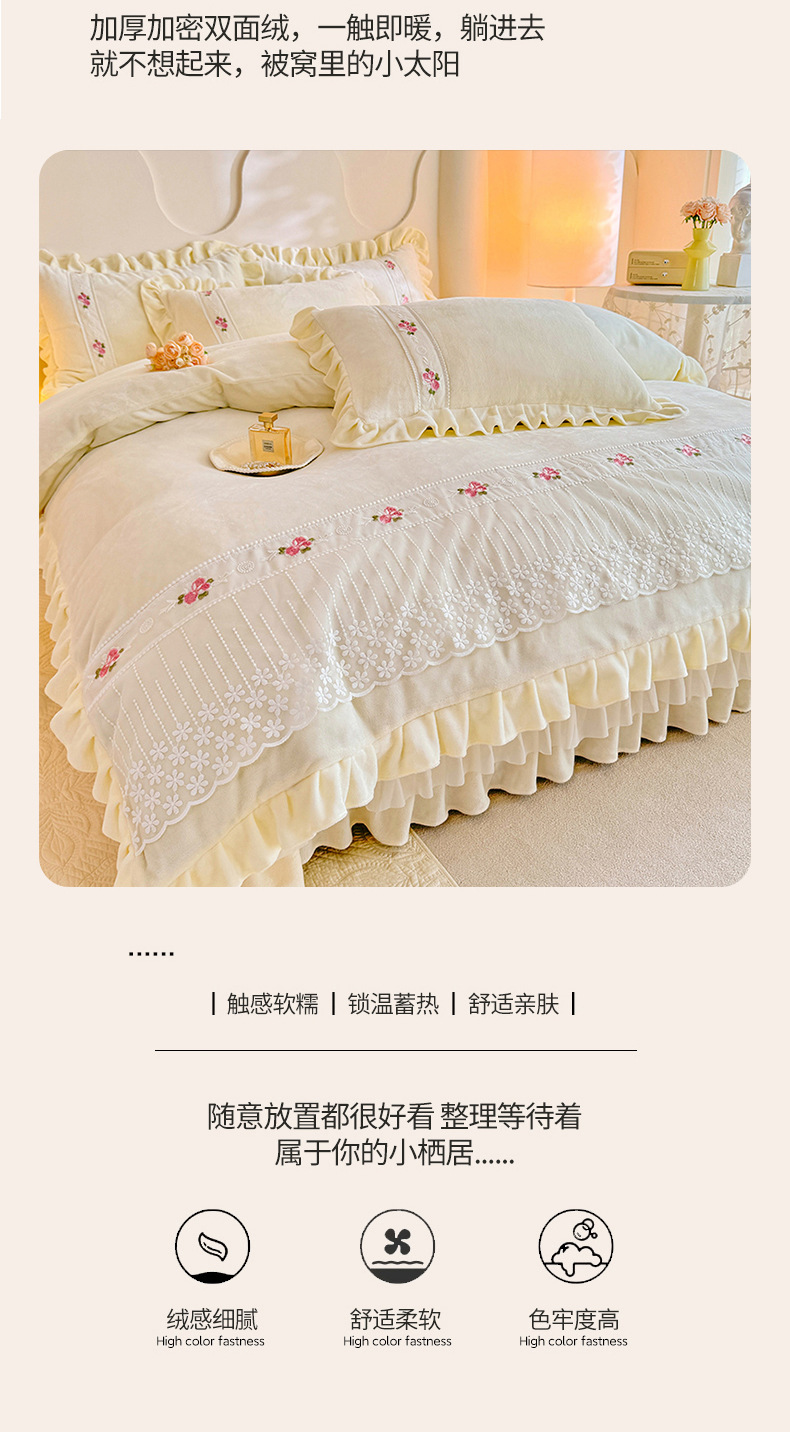 공주 스타일 자수 우유 벨벳 침대 스커트 4 피스 세트 레이스 베이비 벨벳 퀼트 커버 싱글 베이비 바이트