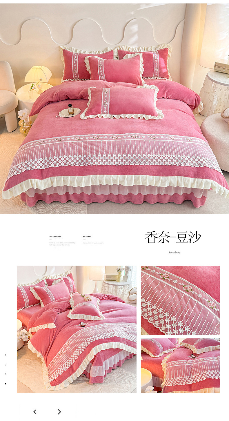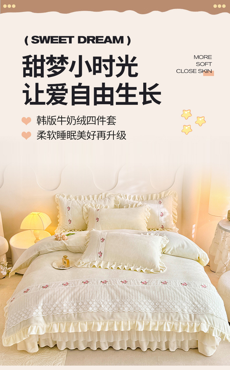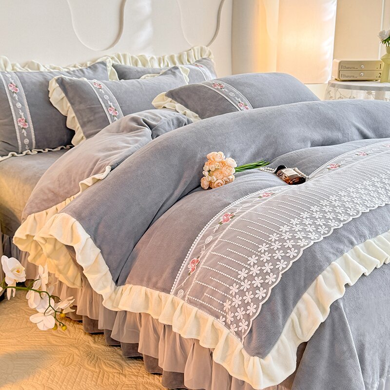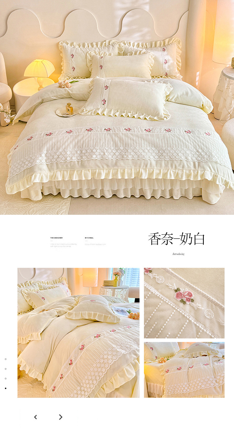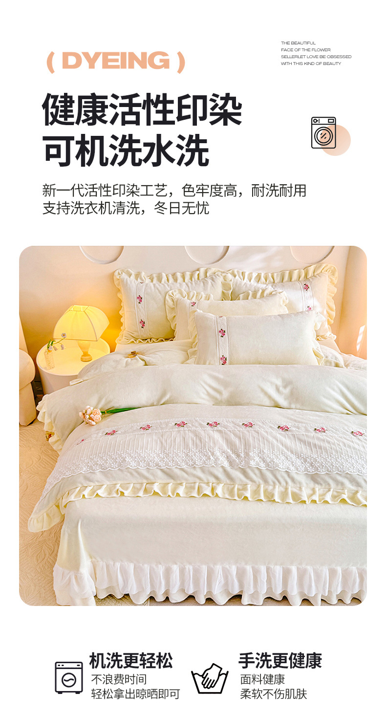 공주 스타일 자수 우유 벨벳 침대 스커트 4 피스 세트 레이스 베이비 벨벳 퀼트 커버 싱글 베이비 바이트