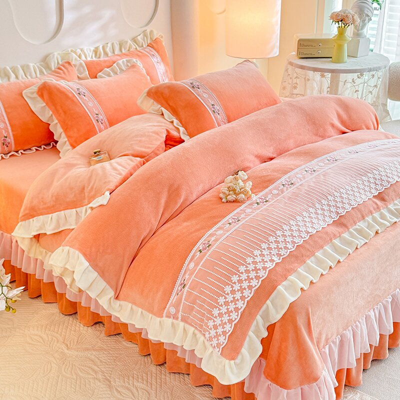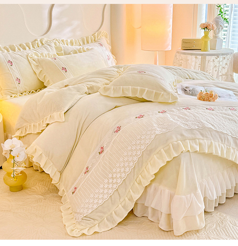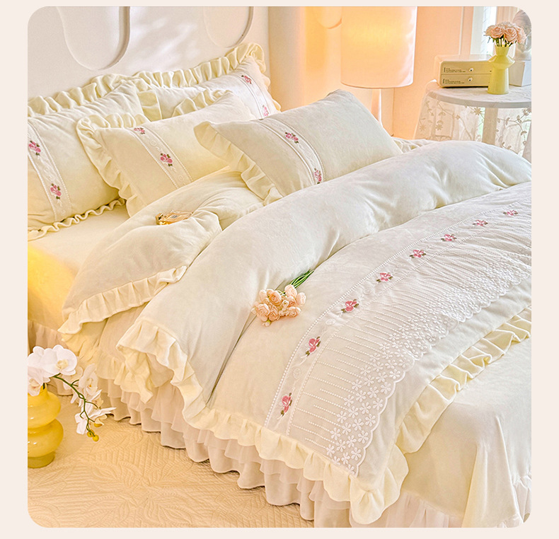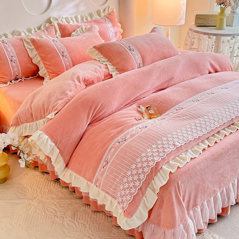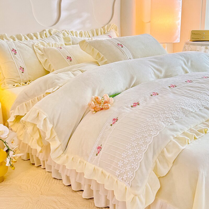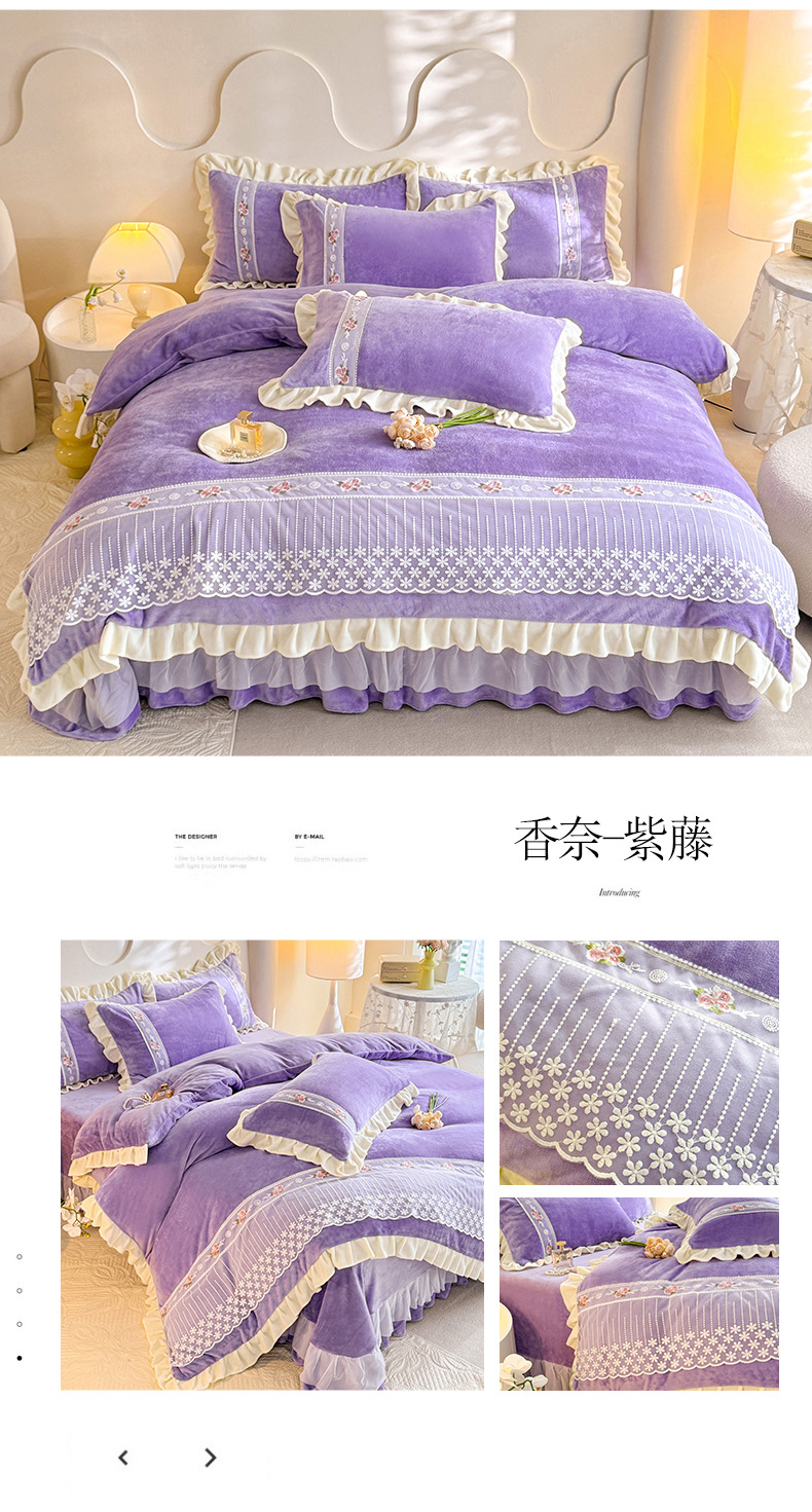 공주 스타일 자수 우유 벨벳 침대 스커트 4 피스 세트 레이스 베이비 벨벳 퀼트 커버 싱글 베이비 바이트