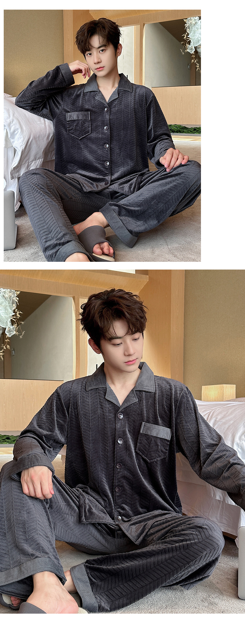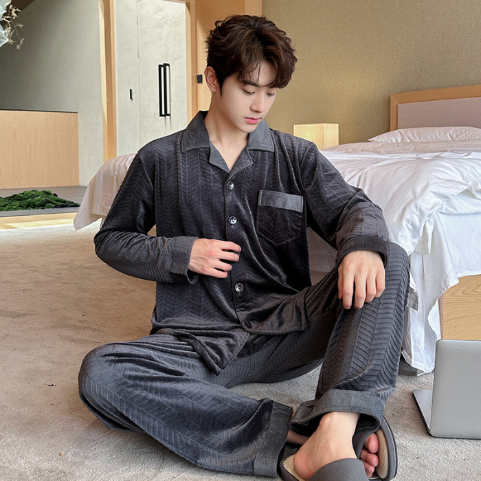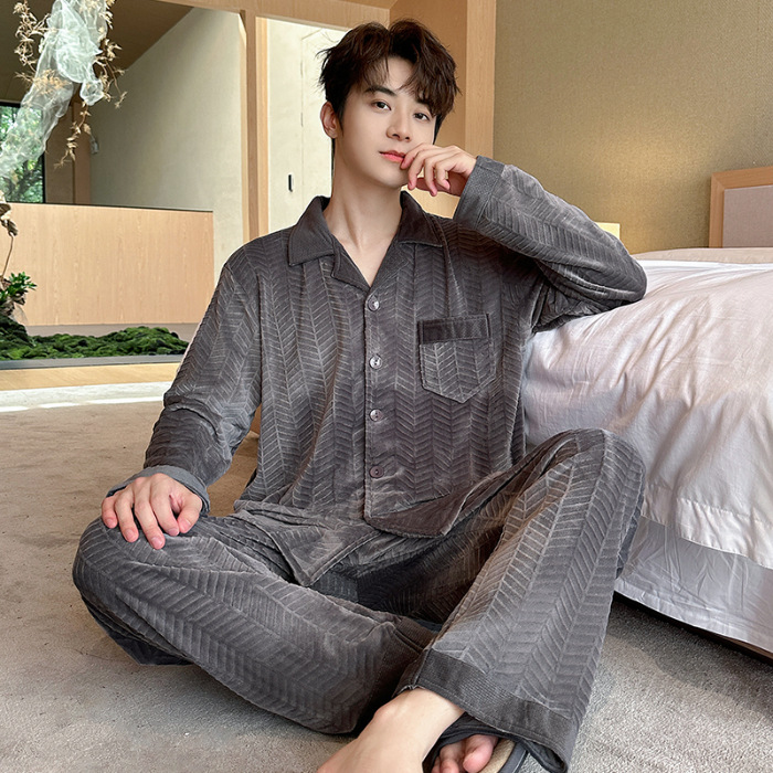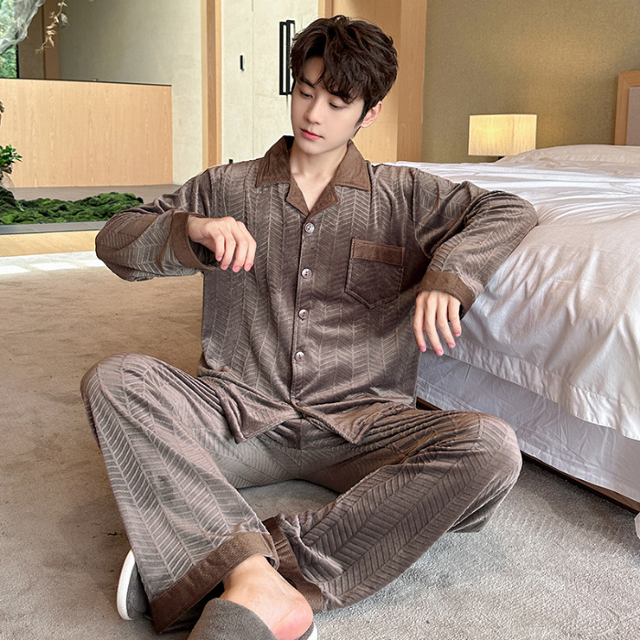 2024 년 새로운 가을과 겨울 남자 잠옷 홈 의류 카디건 긴 소매 섬 벨벳 기모 두꺼운 따뜻한 한국어 버전