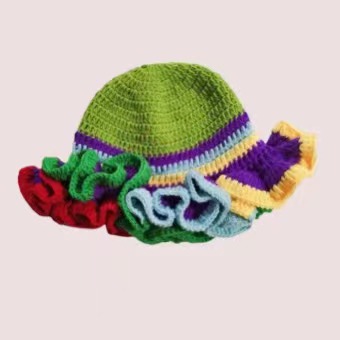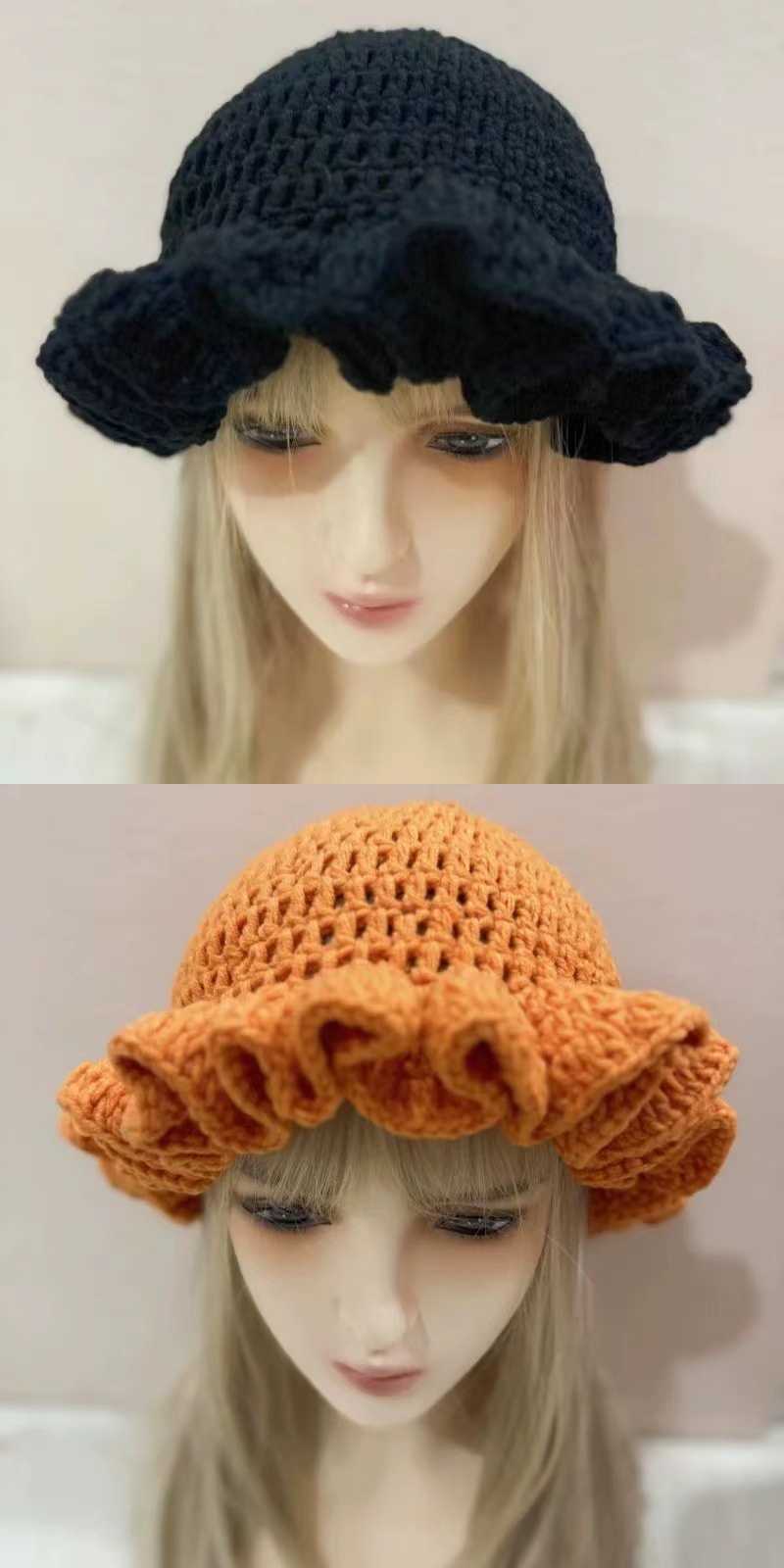 2024纯色荷叶边钩织针织帽褶皱大檐渔夫帽男女搞怪时尚套头帽