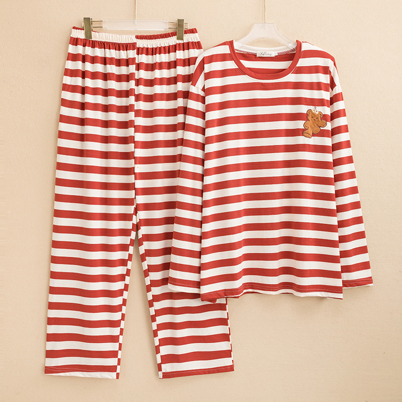 커플 잠옷 남성용 줄무늬 느슨한 플러스 사이즈 긴팔 코튼 니트 간단한 캐주얼 크루 넥 풀오버 홈 의류