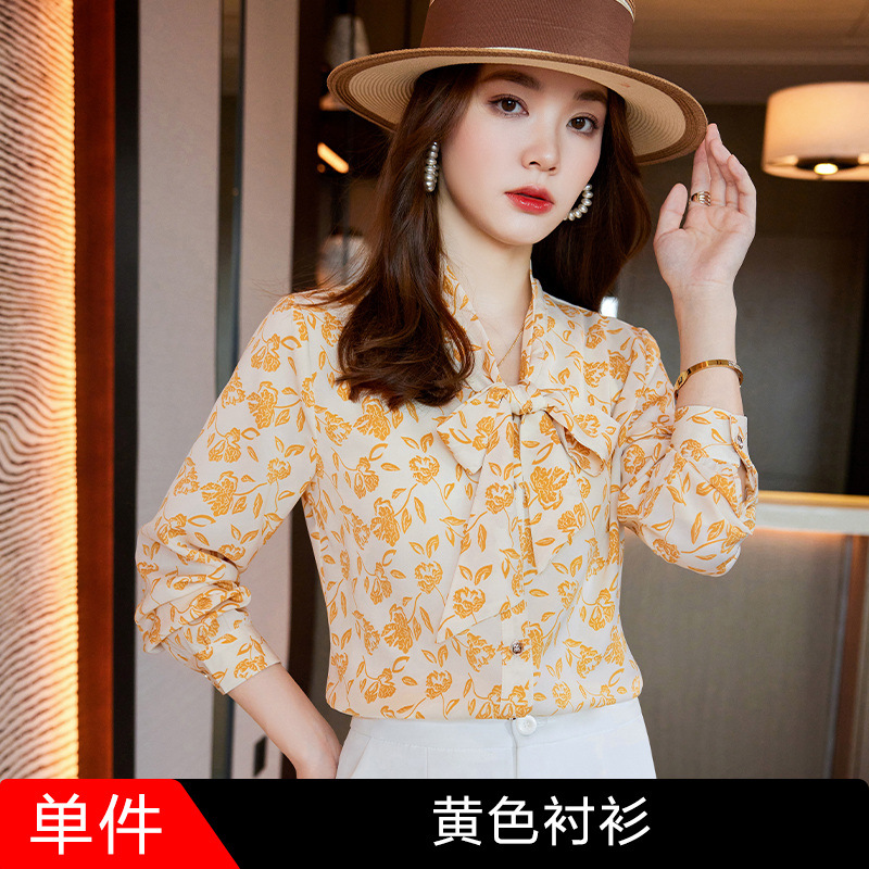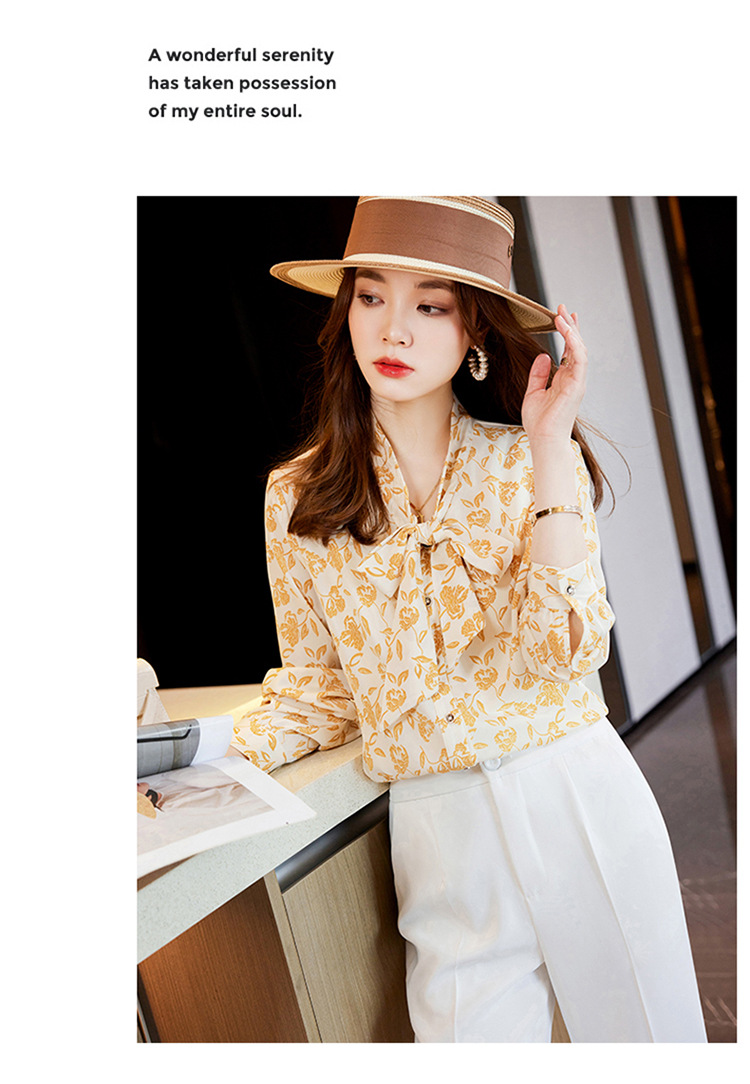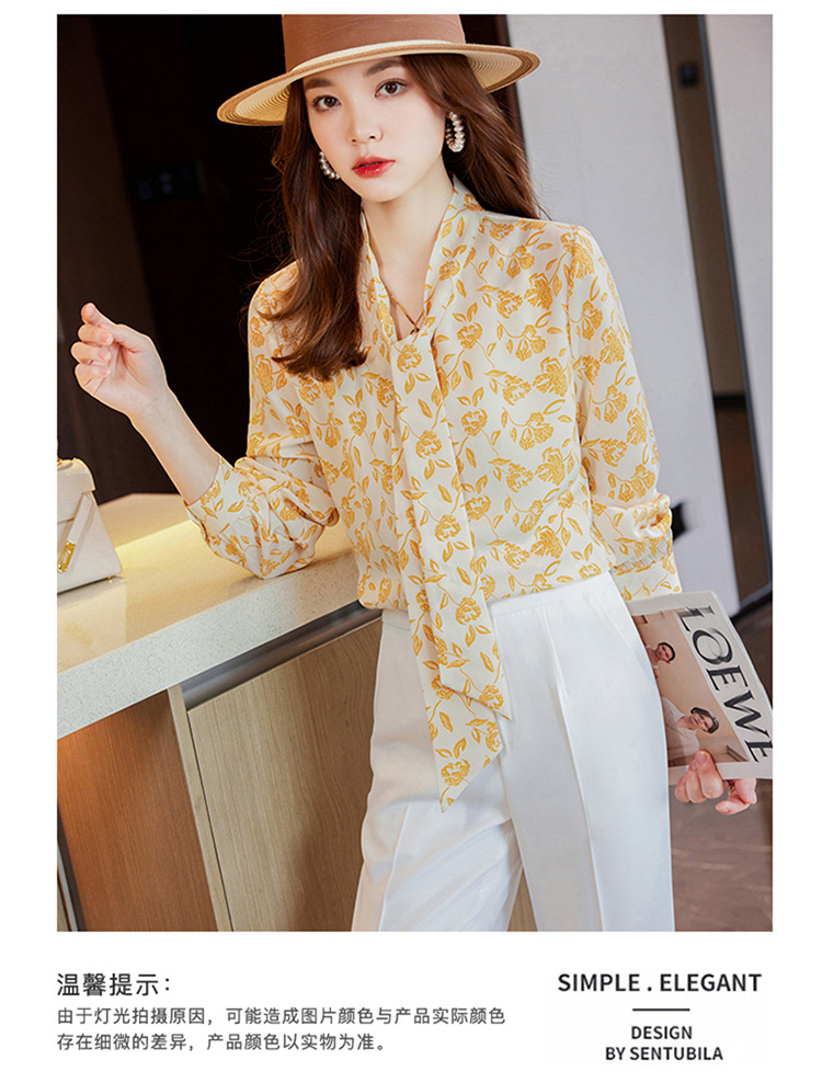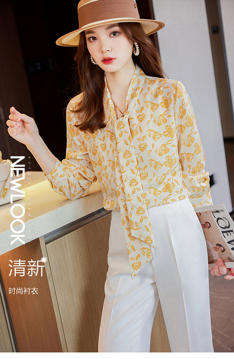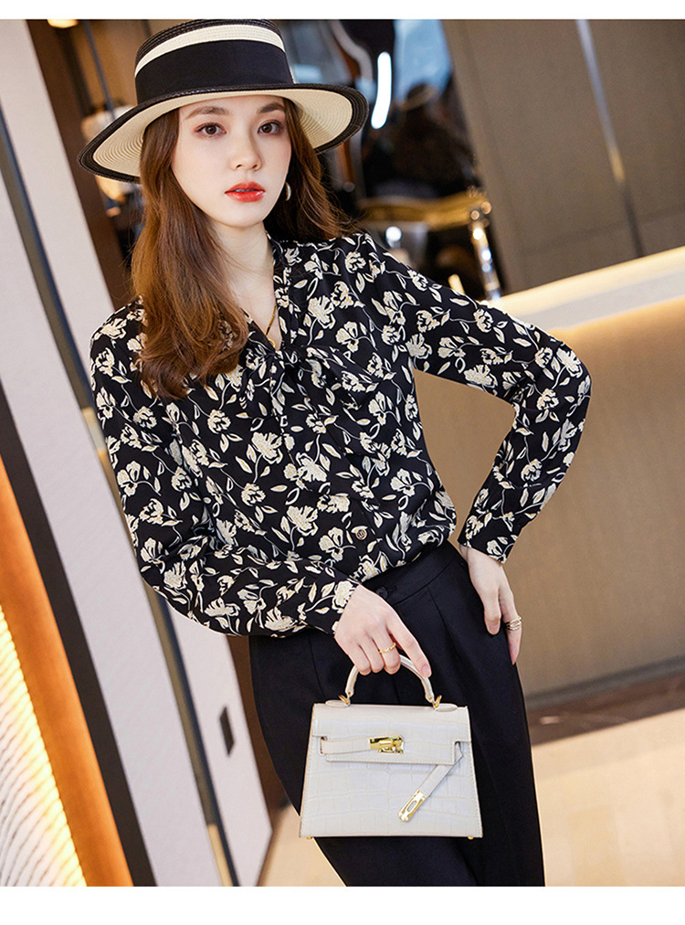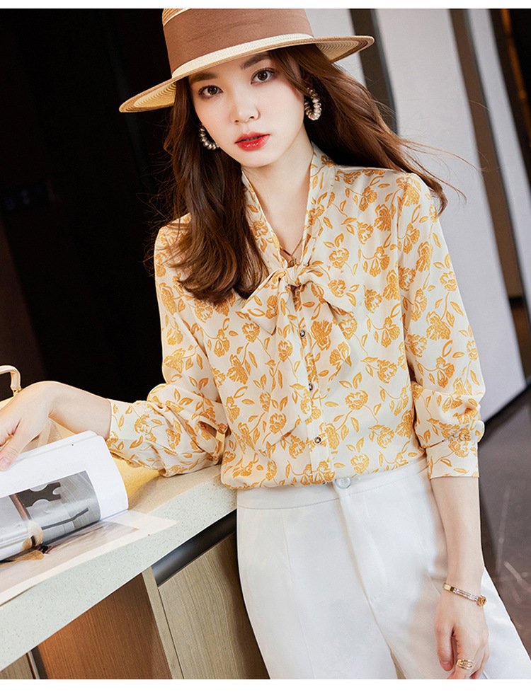 가을 2024 새로운 패션 활 긴팔 셔츠 여성용 새틴 인쇄 무거운 세련된 리본 탑 올 매치스토어 가기