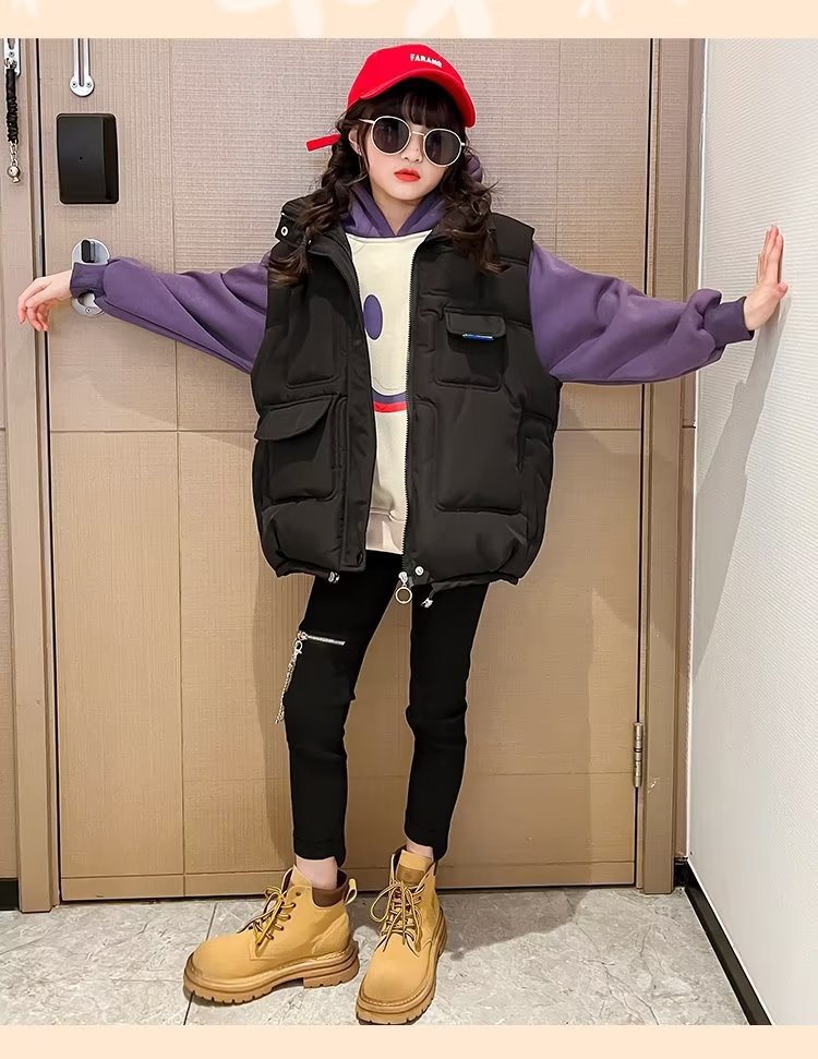 소녀 다운 코튼 조끼 2024 년 가을과 겨울 새로운 큰 어린이 조끼 패셔너블 기모 스웨터 조끼 겨울 아우터웨어