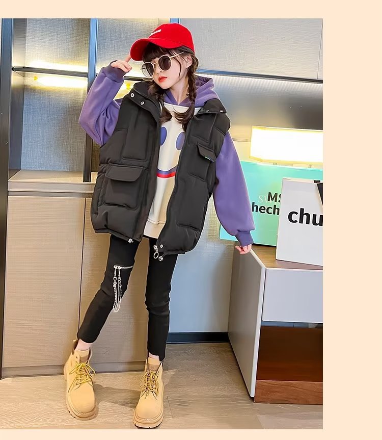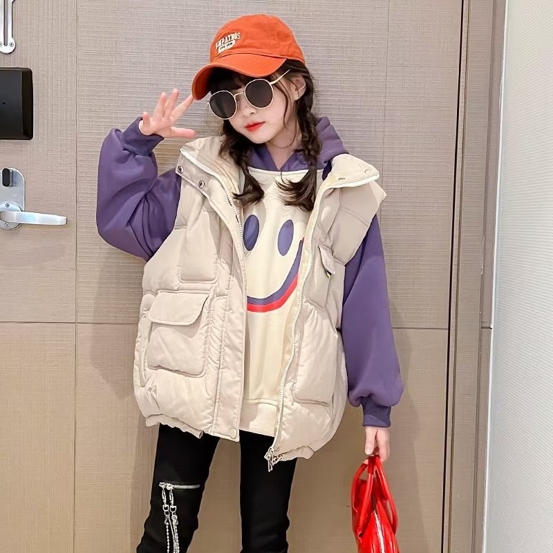 소녀 다운 코튼 조끼 2024 년 가을과 겨울 새로운 큰 어린이 조끼 패셔너블 기모 스웨터 조끼 겨울 아우터웨어스토어 가기
