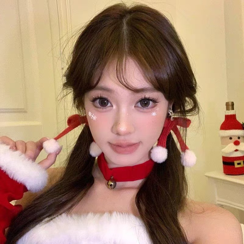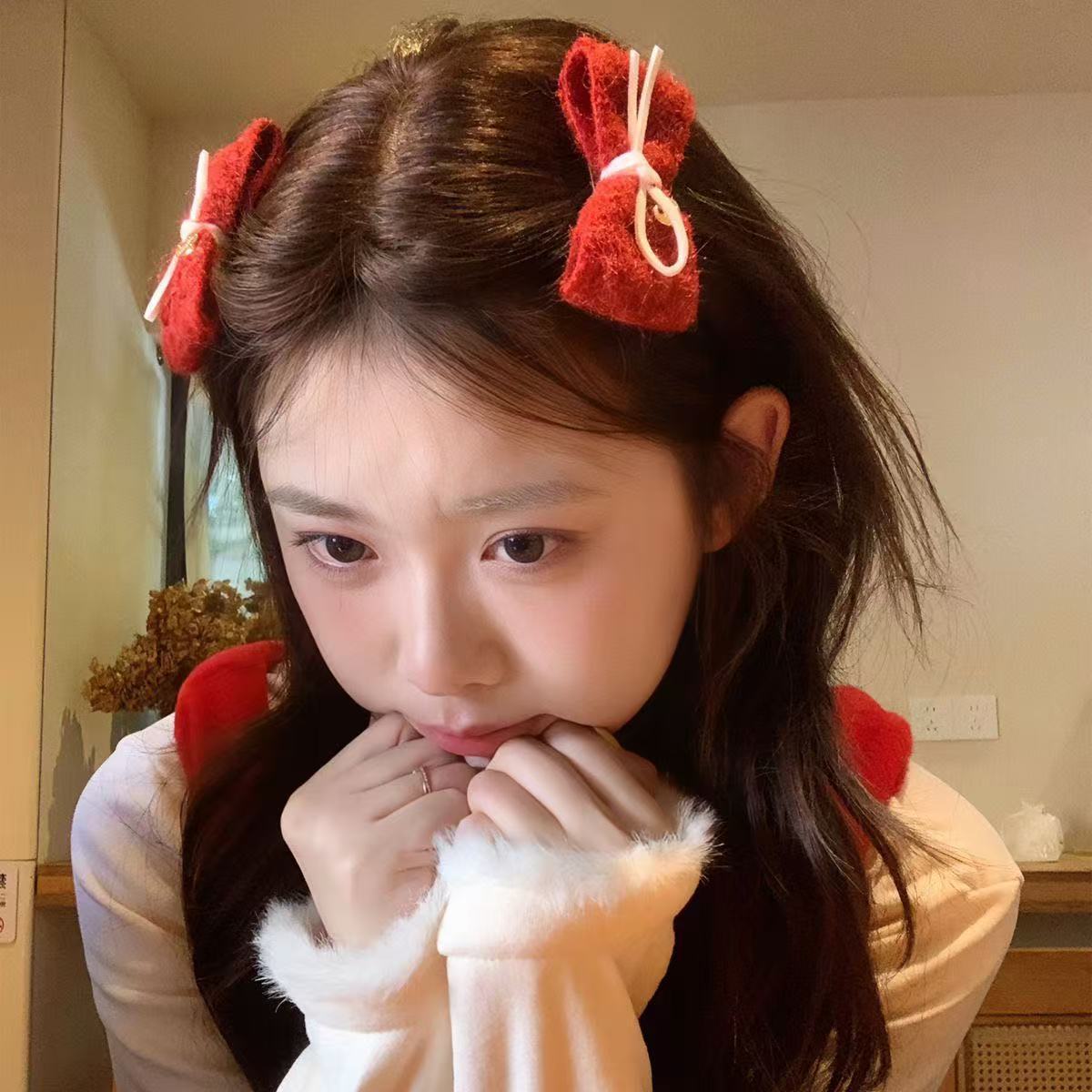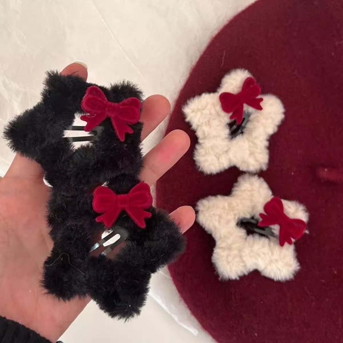 • 7251 화이트 퍼 볼 플로킹 레드 보우 헤어 클립