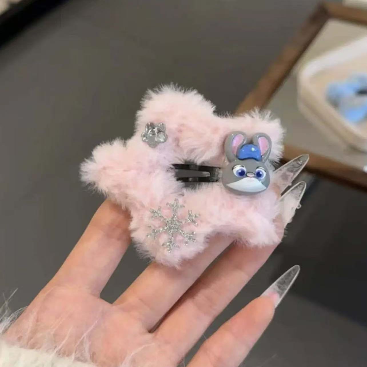 • 7125 털실 별 모양 머리핀 - 큐빅 눈꽃 핑크 토끼