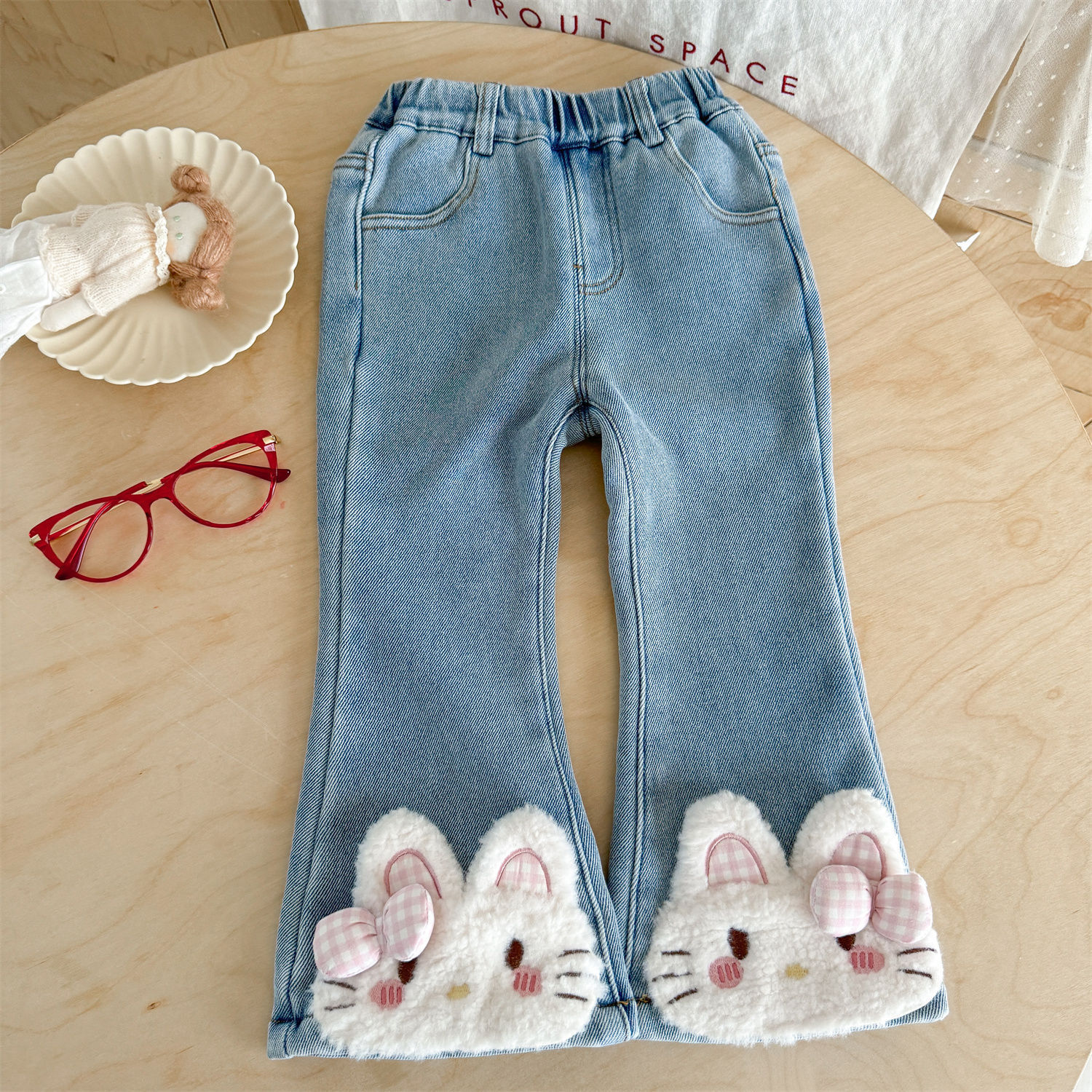 크림색 슈퍼 편한 청바지 2025 여아 가을 겨울 레이스 허리 자수 리본 플러스 벨벳 청바지 트렌디 스타일스토어 가기