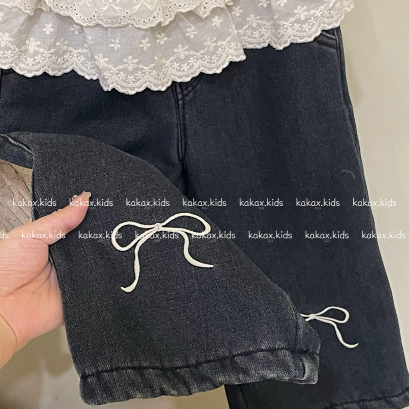 크림색 슈퍼 편한 청바지 2025 여아 가을 겨울 레이스 허리 자수 리본 플러스 벨벳 청바지 트렌디 스타일