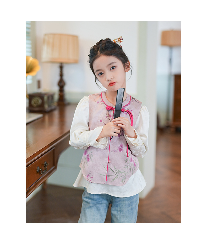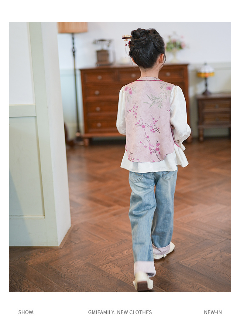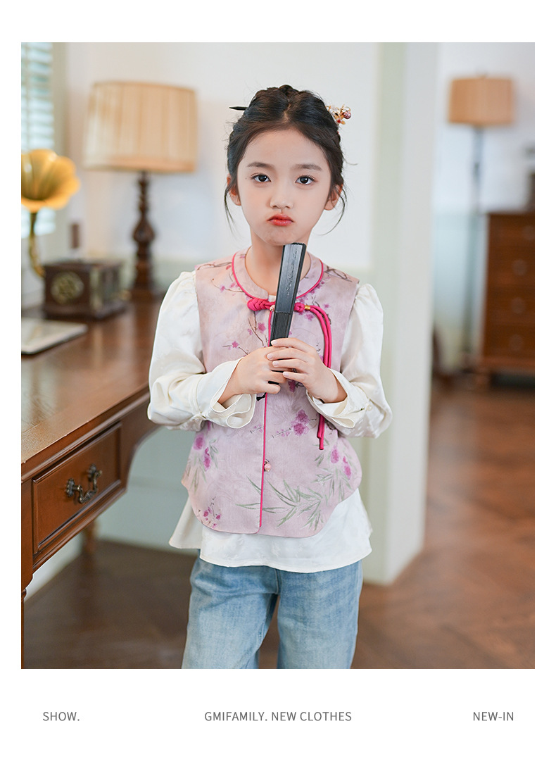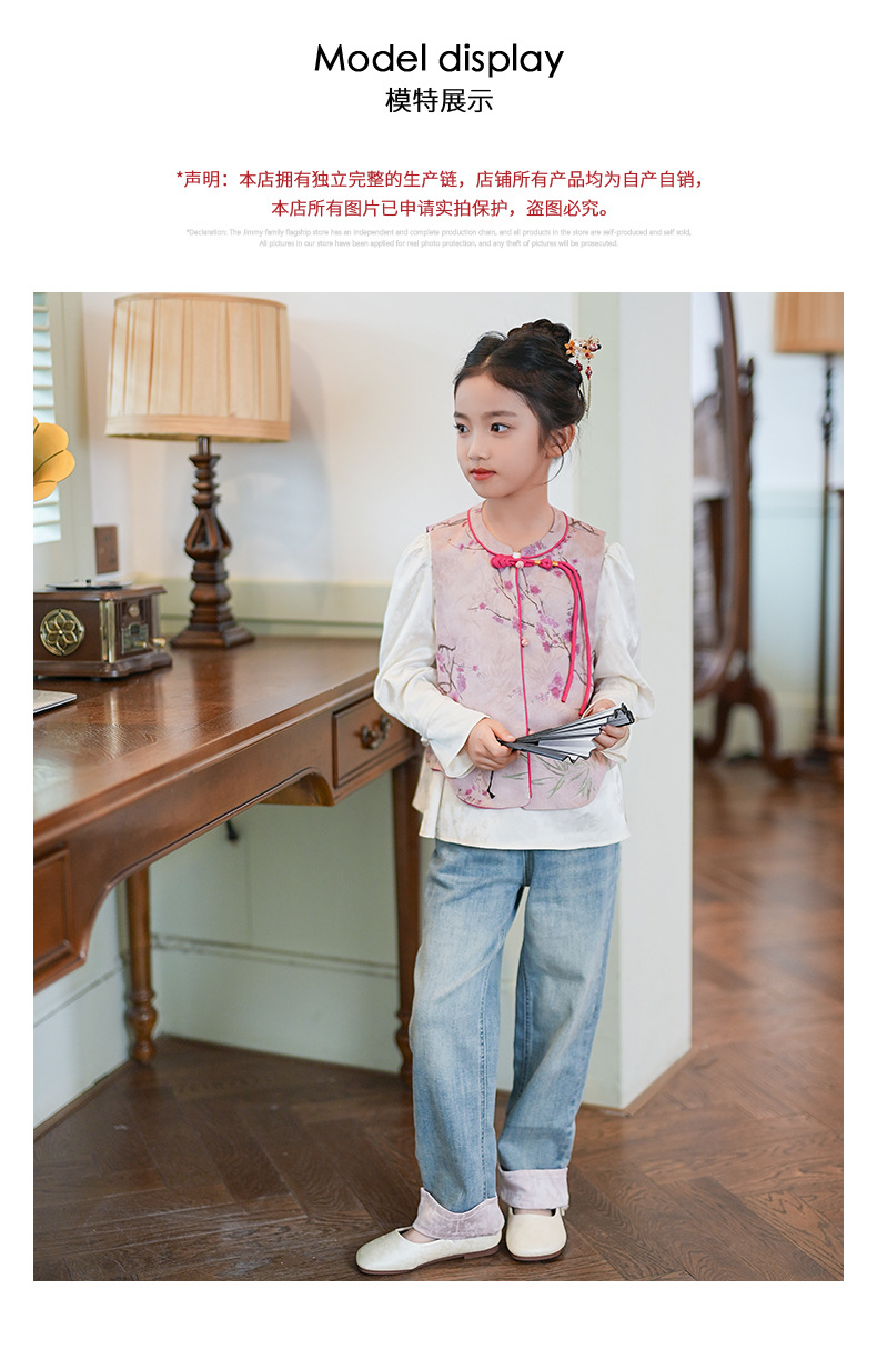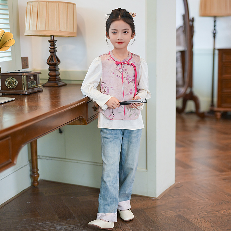 2024 가을 새로운 새로운 중국 스타일 소녀의 어린이 착용 아기 소녀의 국가 스타일 조끼 봄과 가을 서양식 공주 외부 조끼스토어 가기