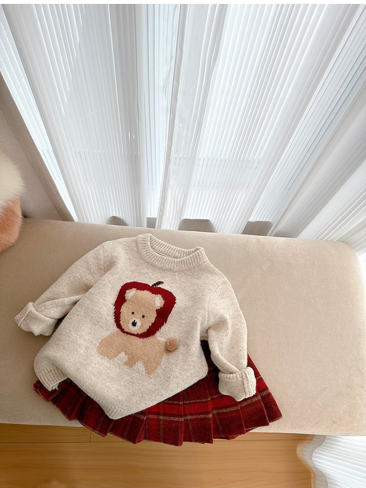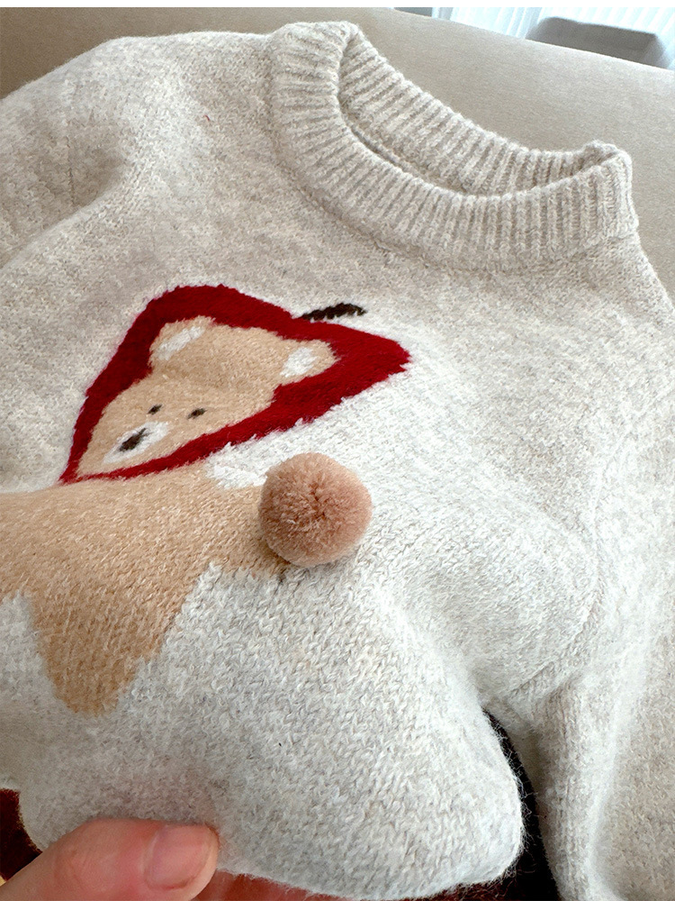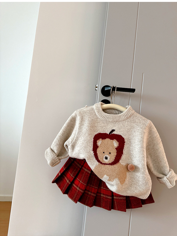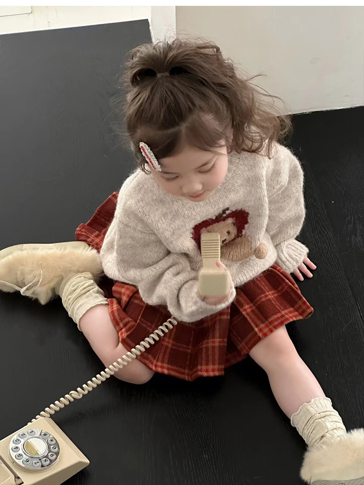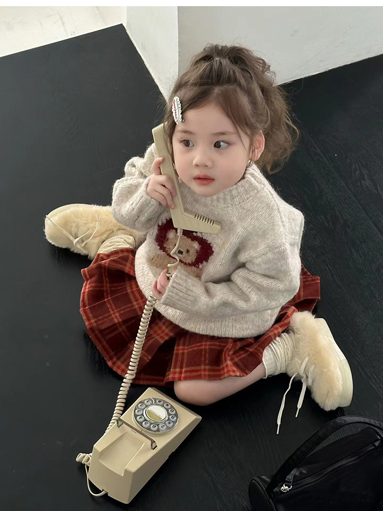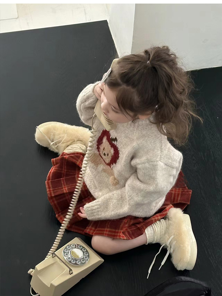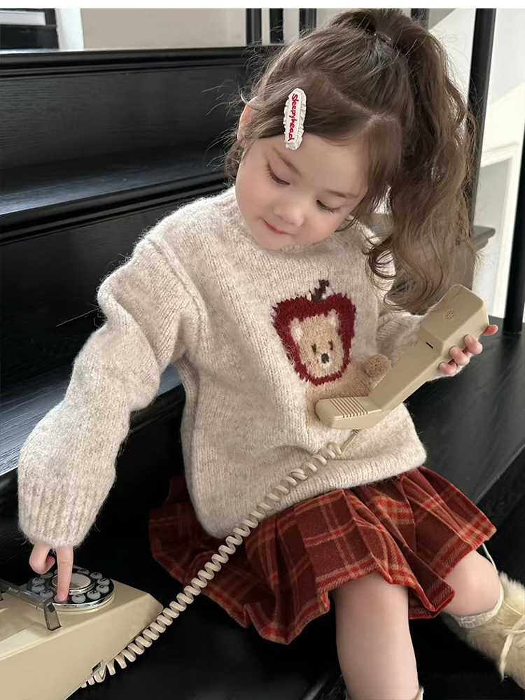 어린이 스웨터 가을과 겨울 2024 새로운 소녀의 서양 스타일 귀여운 만화 자수 니트 셔츠 카키 탑스토어 가기