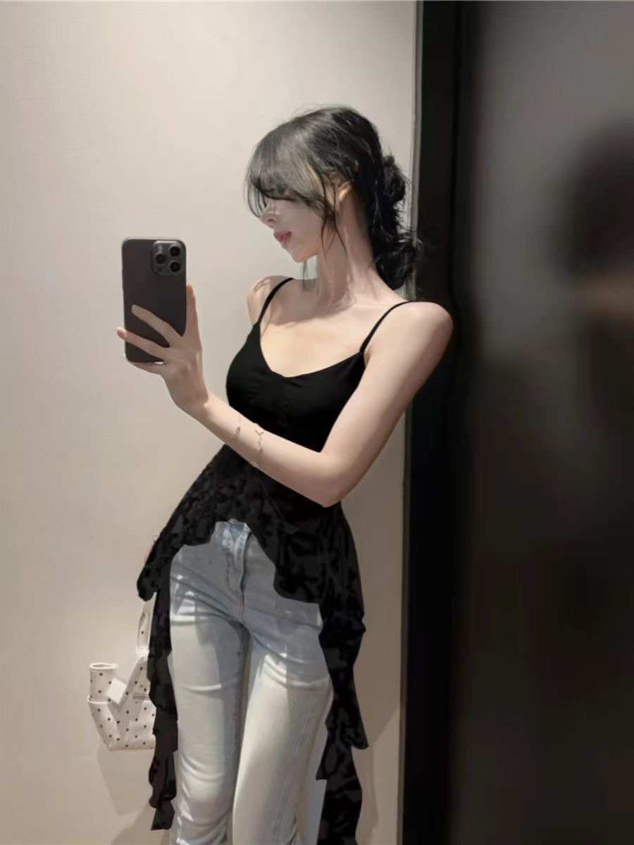 프랑스 스타일 우아한 틈새 디자인 감각 독특한 슬림 핏 슬리밍 V 넥 우아한 레이스 짧은 슬링 올 매치 탑스토어 가기
