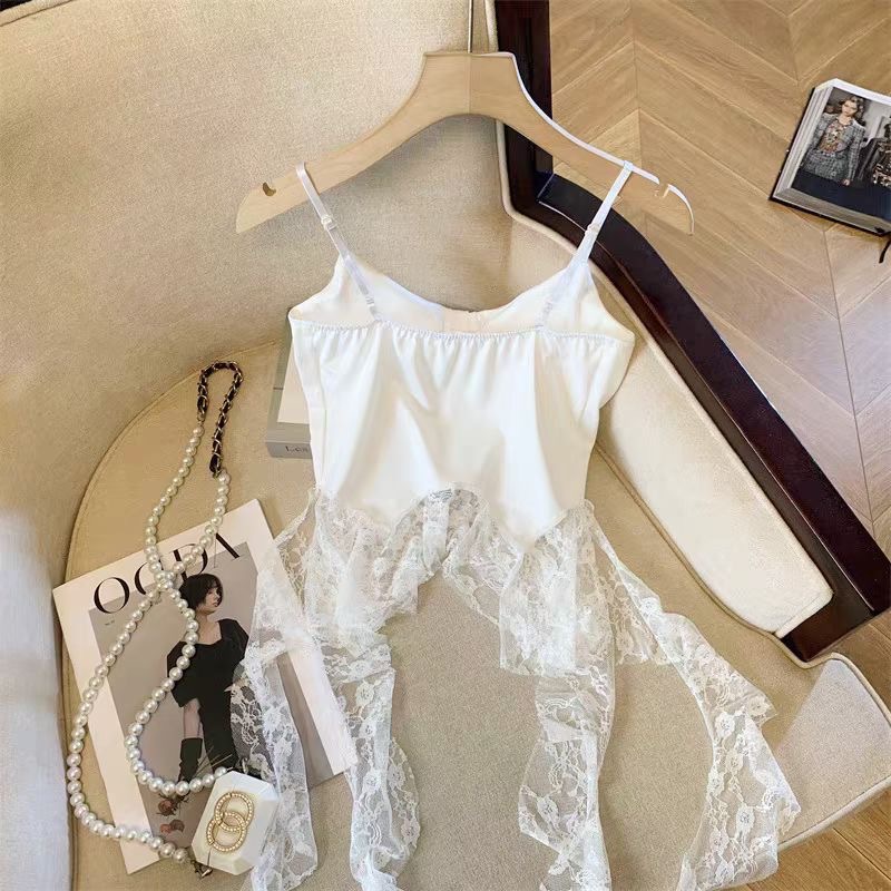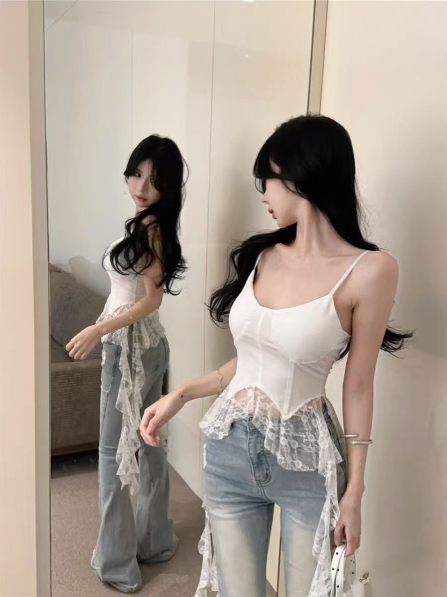 프랑스 스타일 우아한 틈새 디자인 감각 독특한 슬림 핏 슬리밍 V 넥 우아한 레이스 짧은 슬링 올 매치 탑