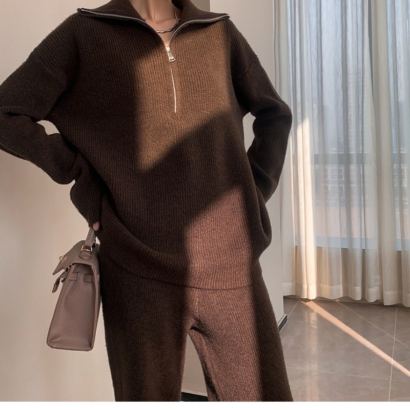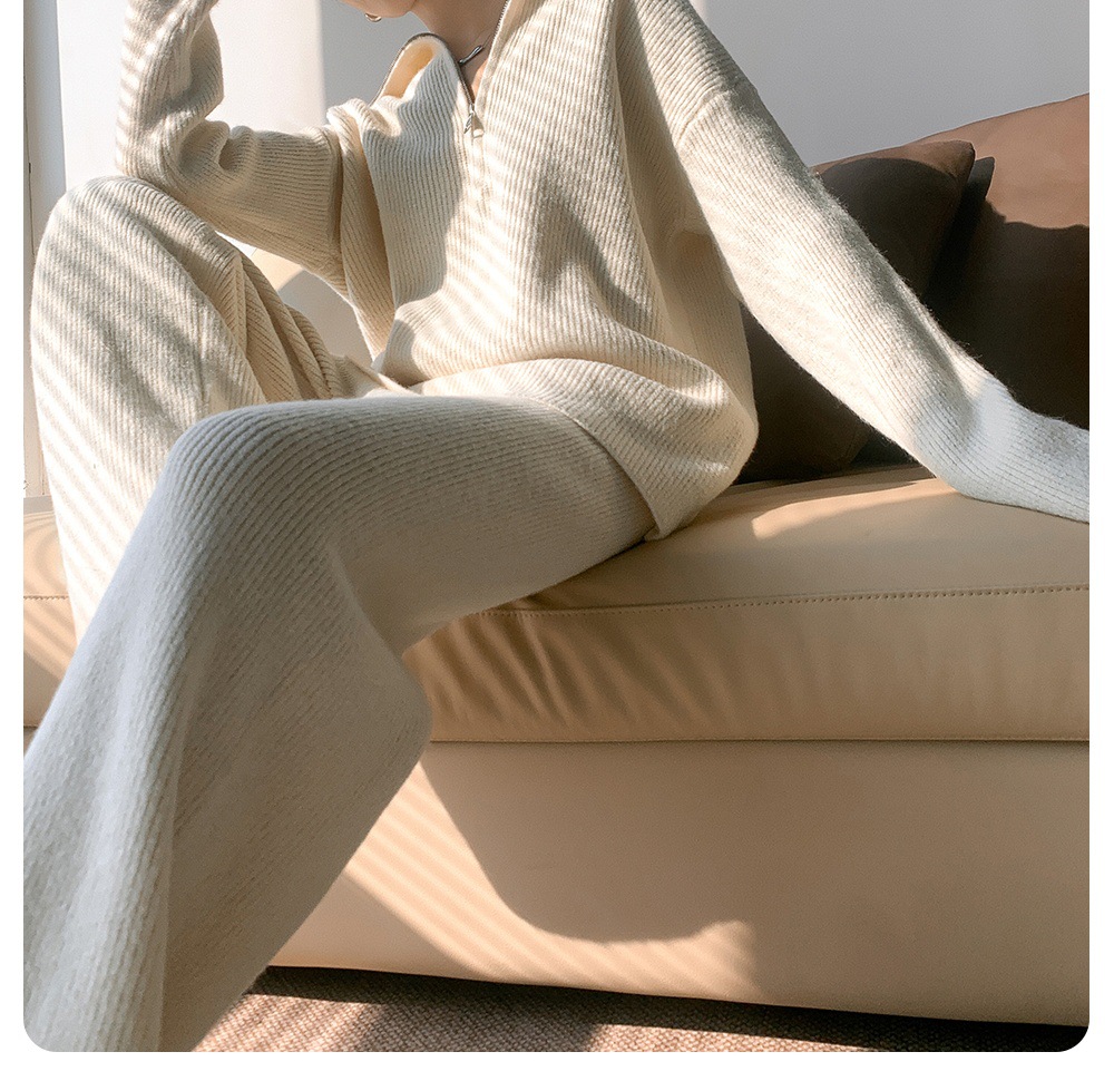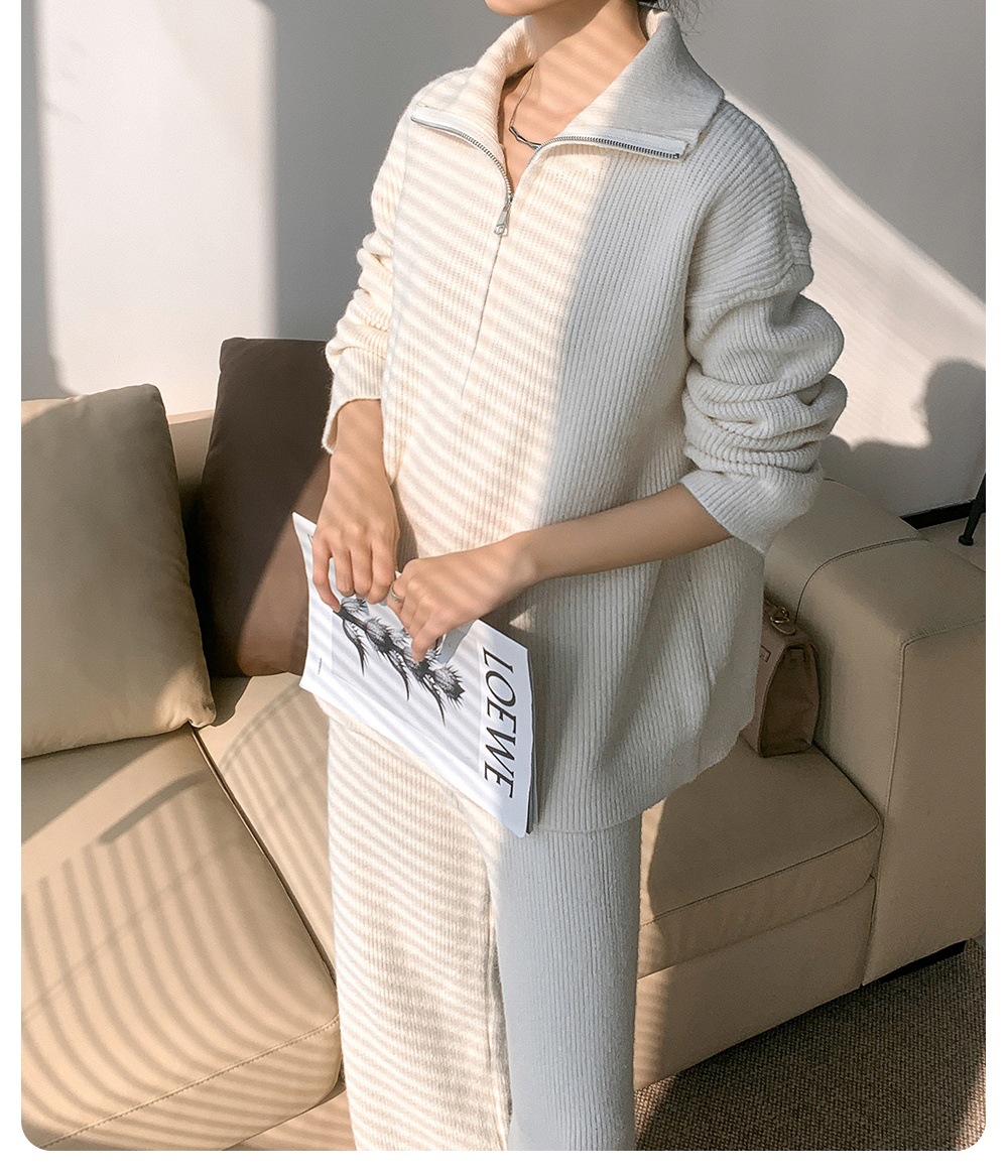 유럽풍 하이넥 지퍼 니트 풀오버 세트 여성용 가을 겨울 루즈핏 와이드 팬츠 투피스 세트스토어 가기
