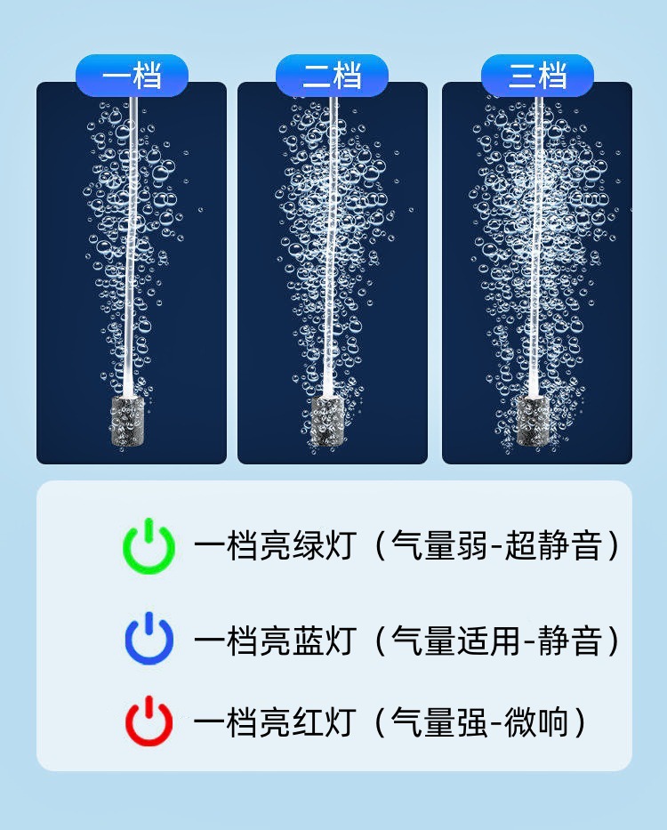 本产品适宜需要安静的环境养鱼、钓鱼使用!如客厅、卧室、办公室、户外钓鱼等、一档几乎没有任何声音。可三档调节气量,间歇持续使用功能,自带背扣和电量显示功能,可长期持续不停机使用,小巧大气携带方便用途多。