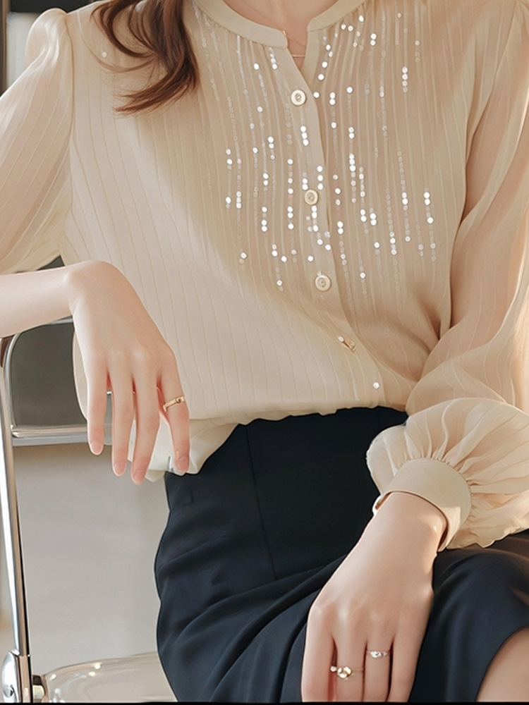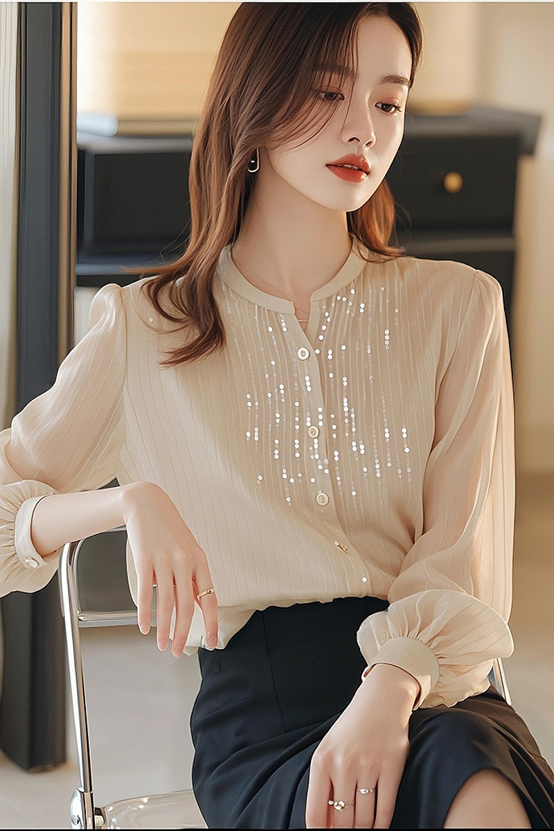 이른 가을 새로운 서양 스타일 세련된 작은 셔츠 스타일 문자 베이지 색 세퀸 쉬폰 셔츠 최고 여성 여름