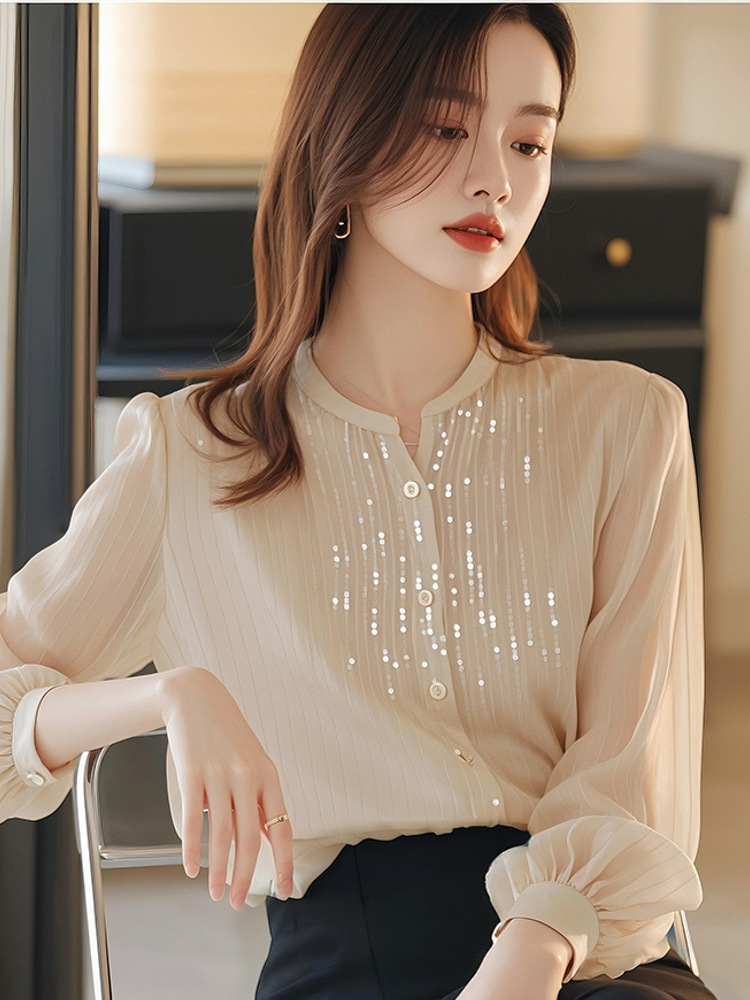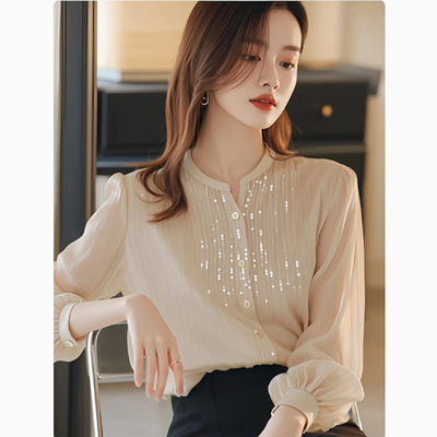 이른 가을 새로운 서양 스타일 세련된 작은 셔츠 스타일 문자 베이지 색 세퀸 쉬폰 셔츠 최고 여성 여름스토어 가기