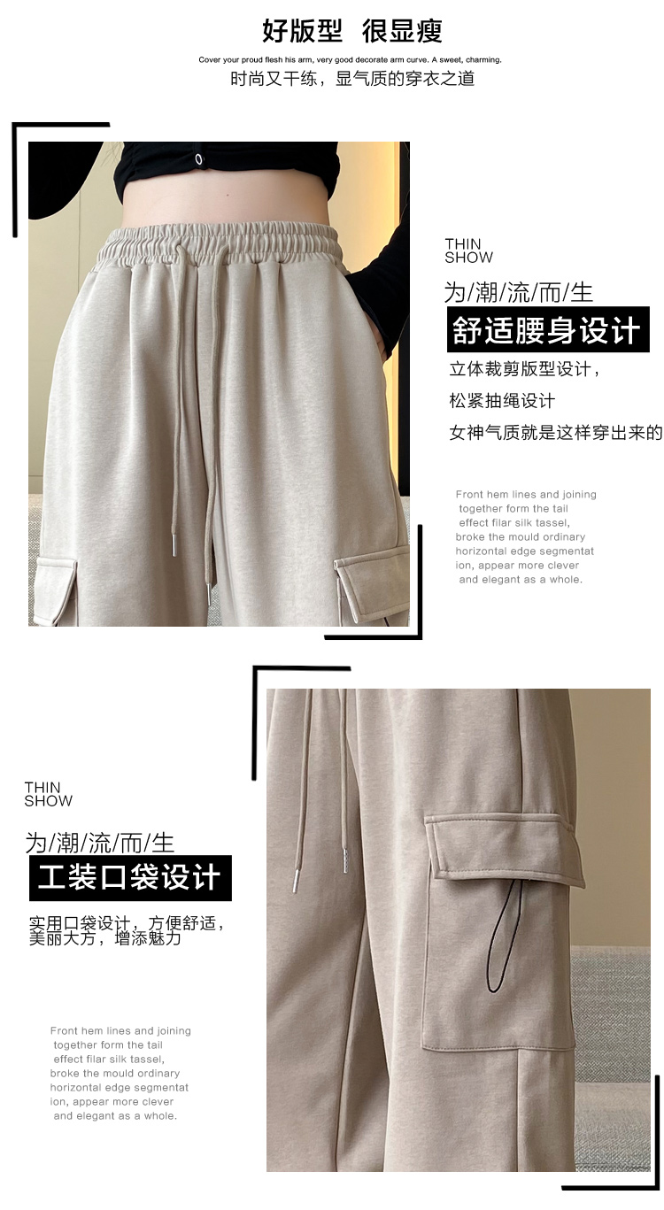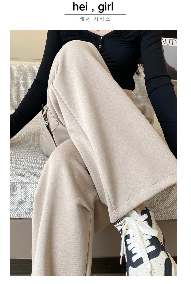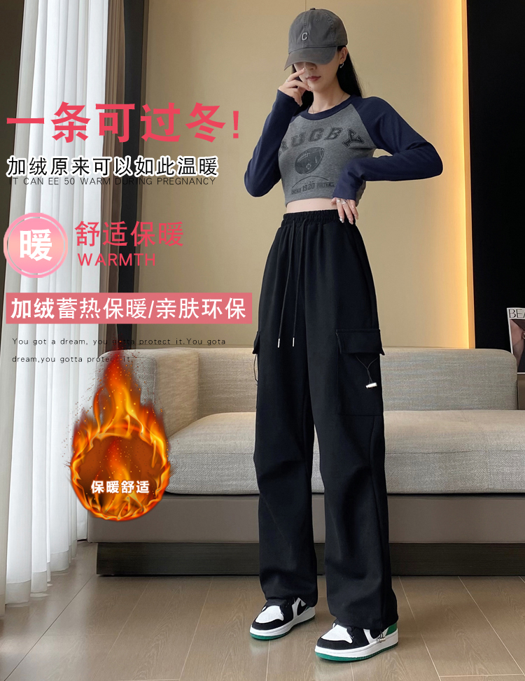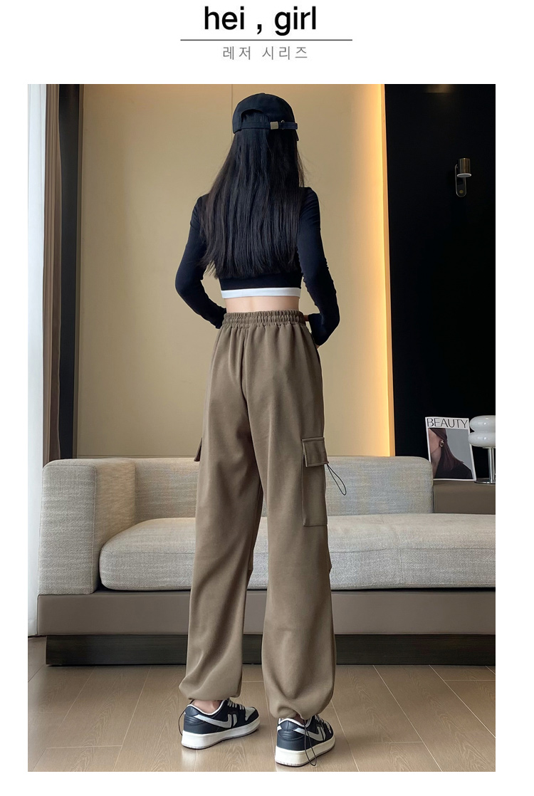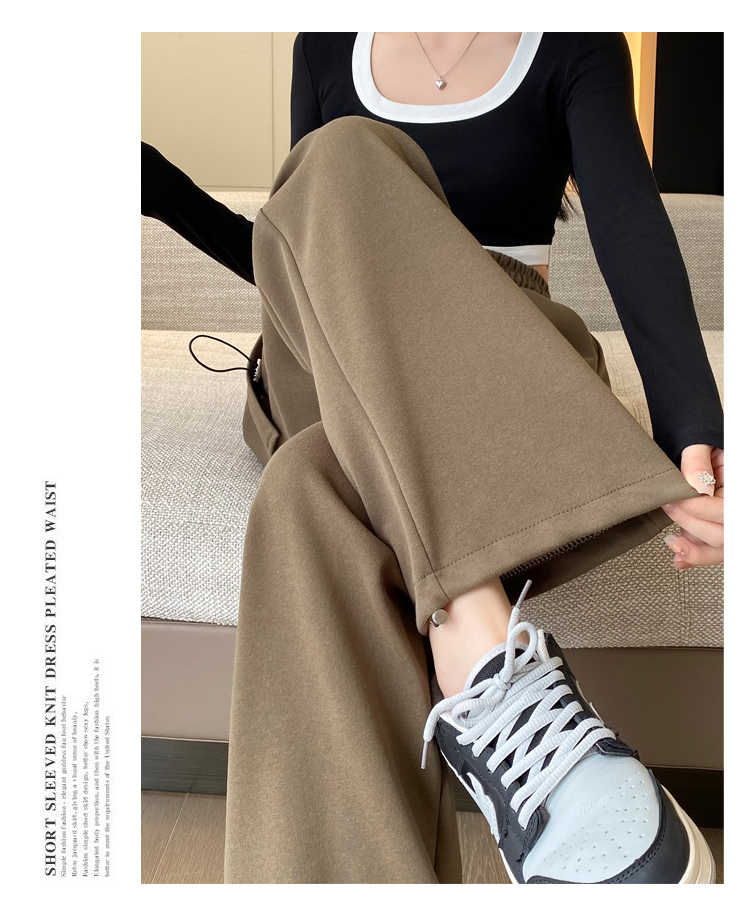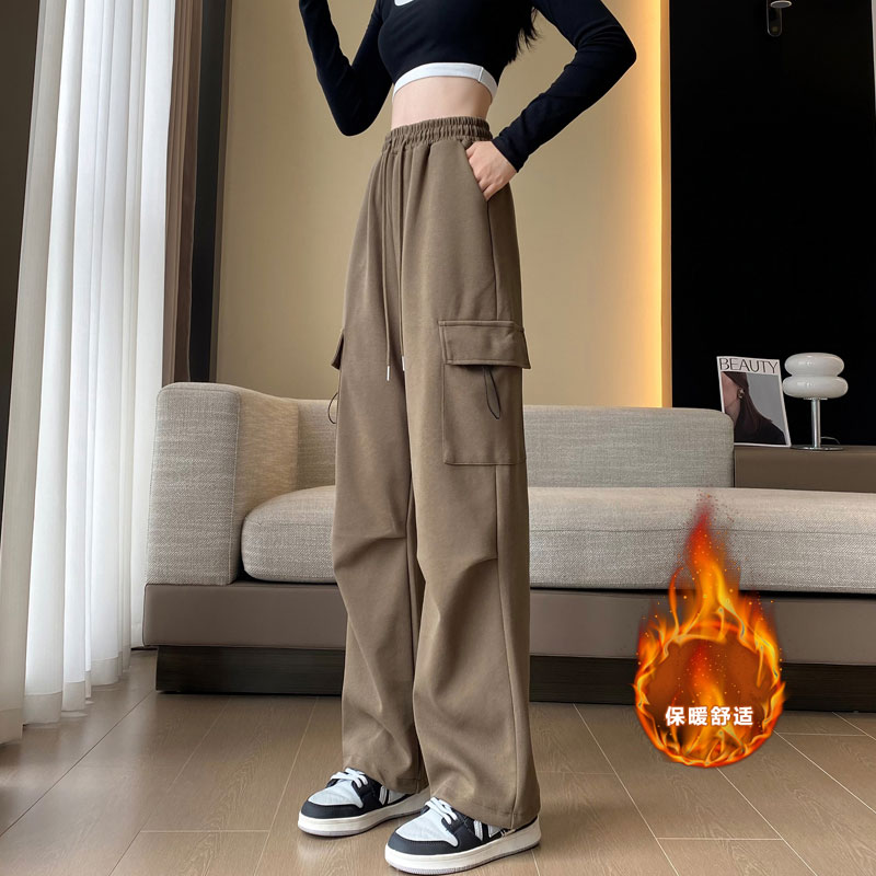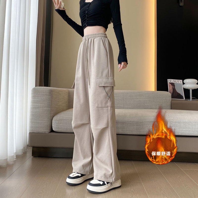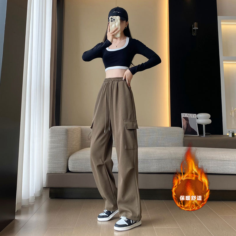 미국 스타일 기모 주의 바지 여성 가을 및 겨울 높은 허리 스트랩 Dagging 스트레이트 다리 넓은 다리 바지 작은 캐주얼 스포츠 바지스토어 가기