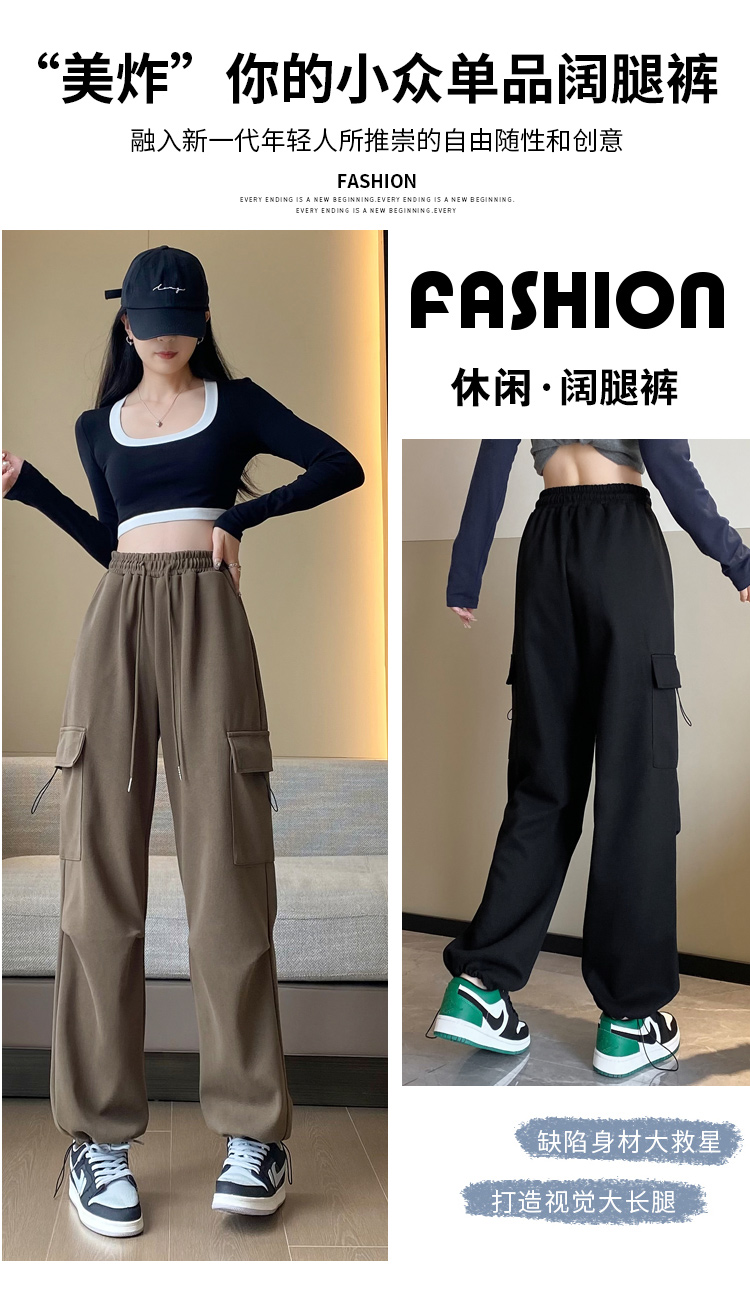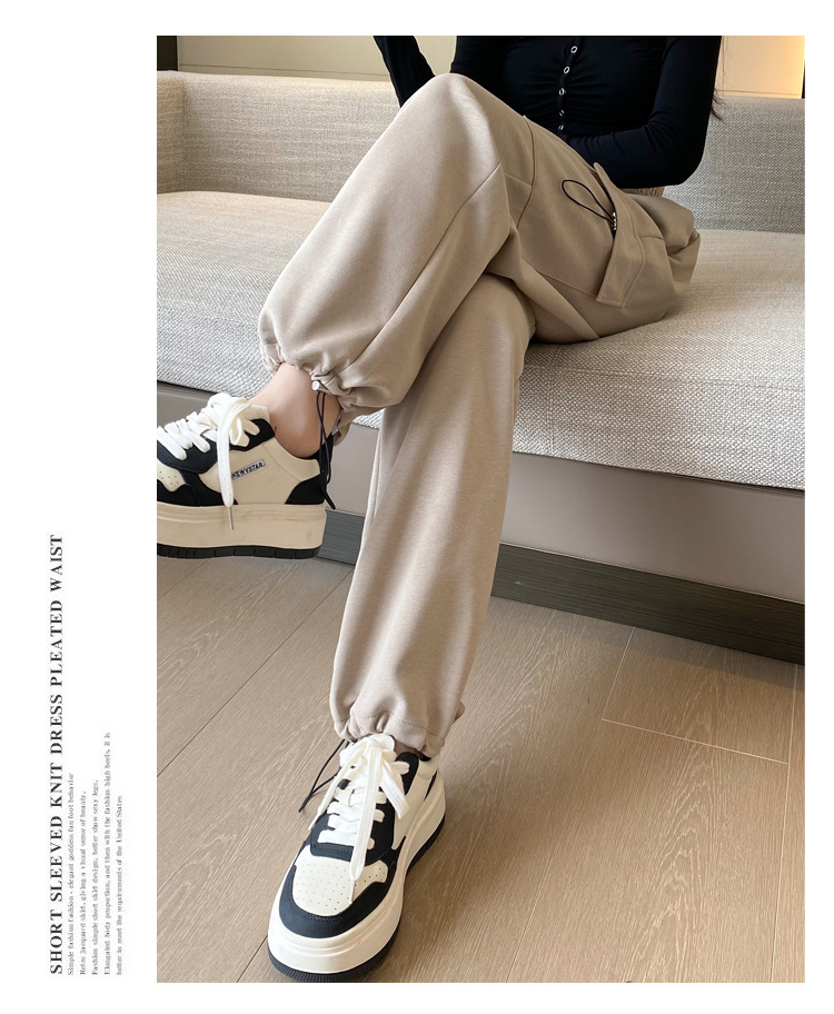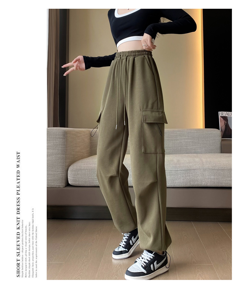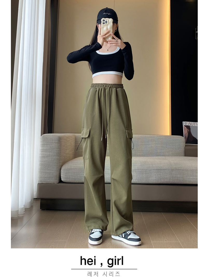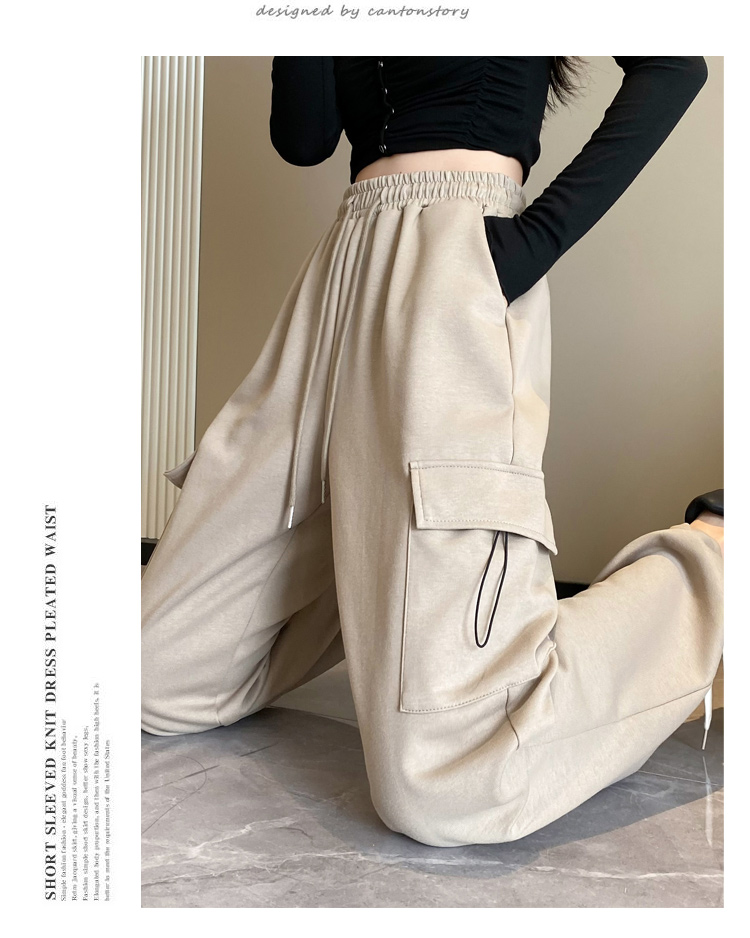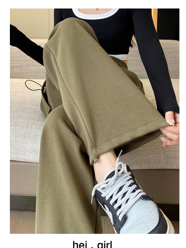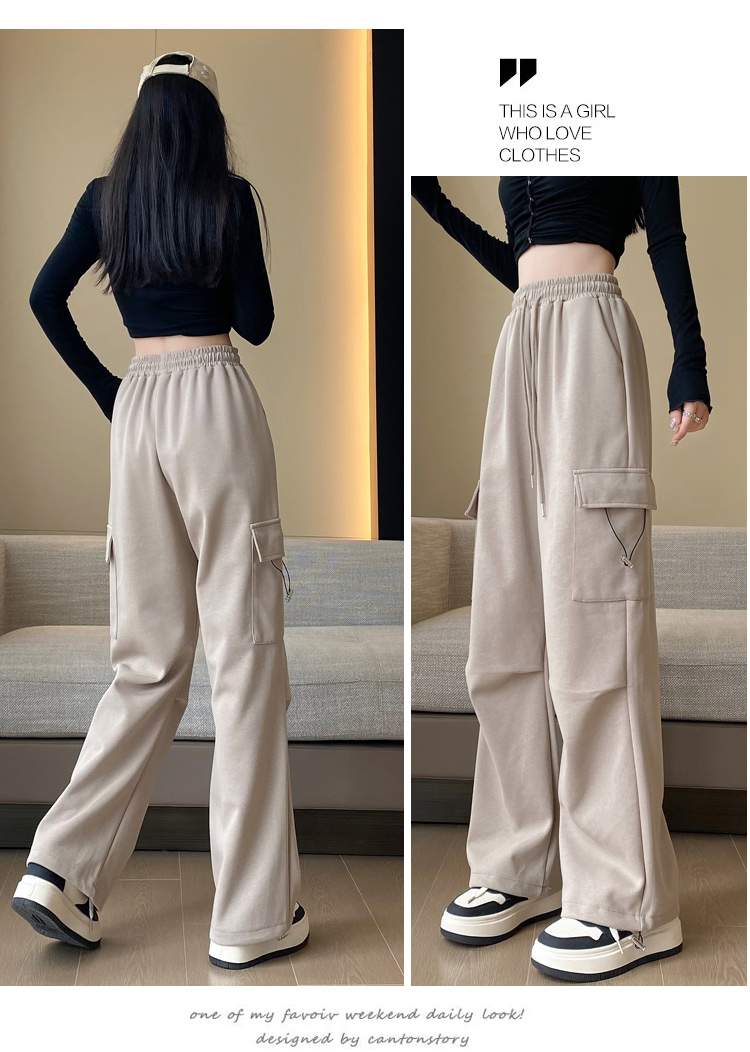 미국 스타일 기모 주의 바지 여성 가을 및 겨울 높은 허리 스트랩 Dagging 스트레이트 다리 넓은 다리 바지 작은 캐주얼 스포츠 바지스토어 가기