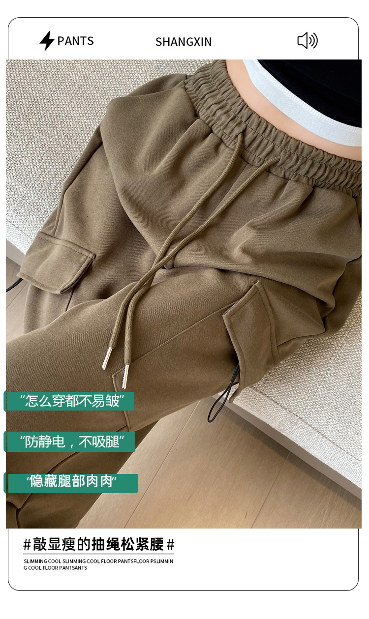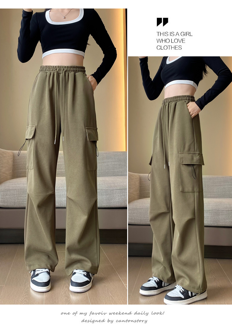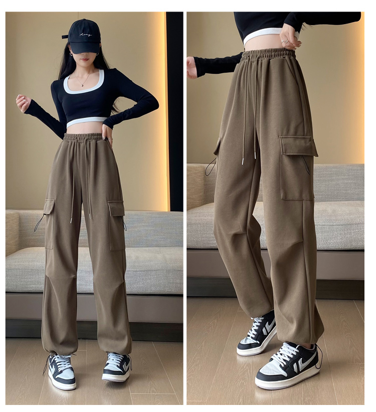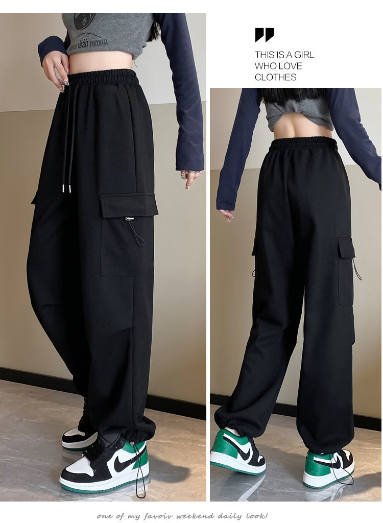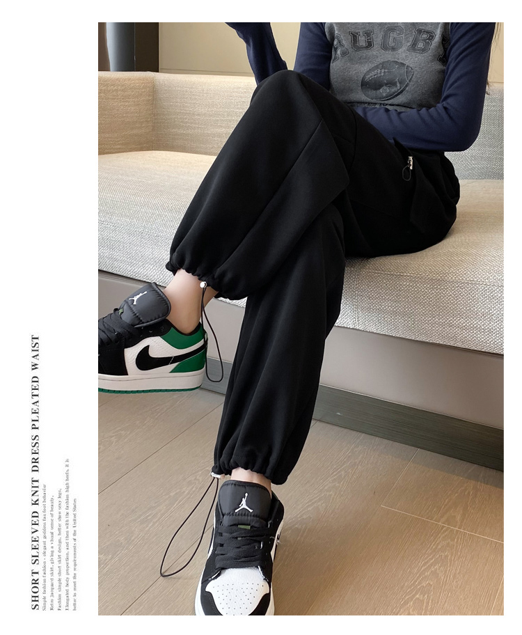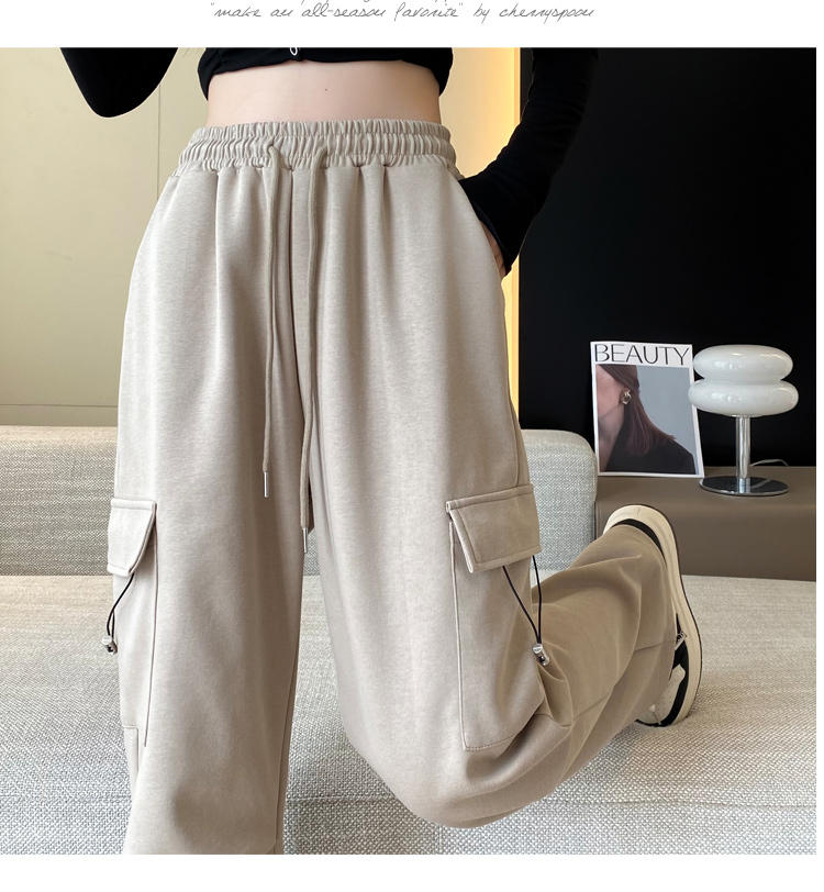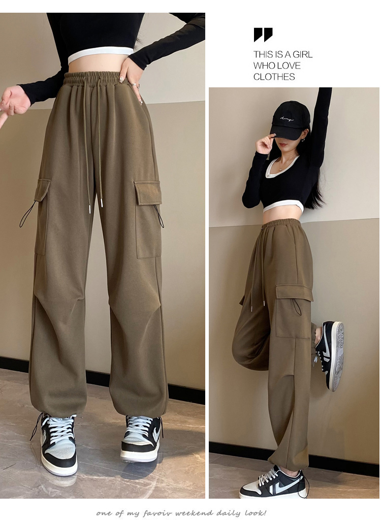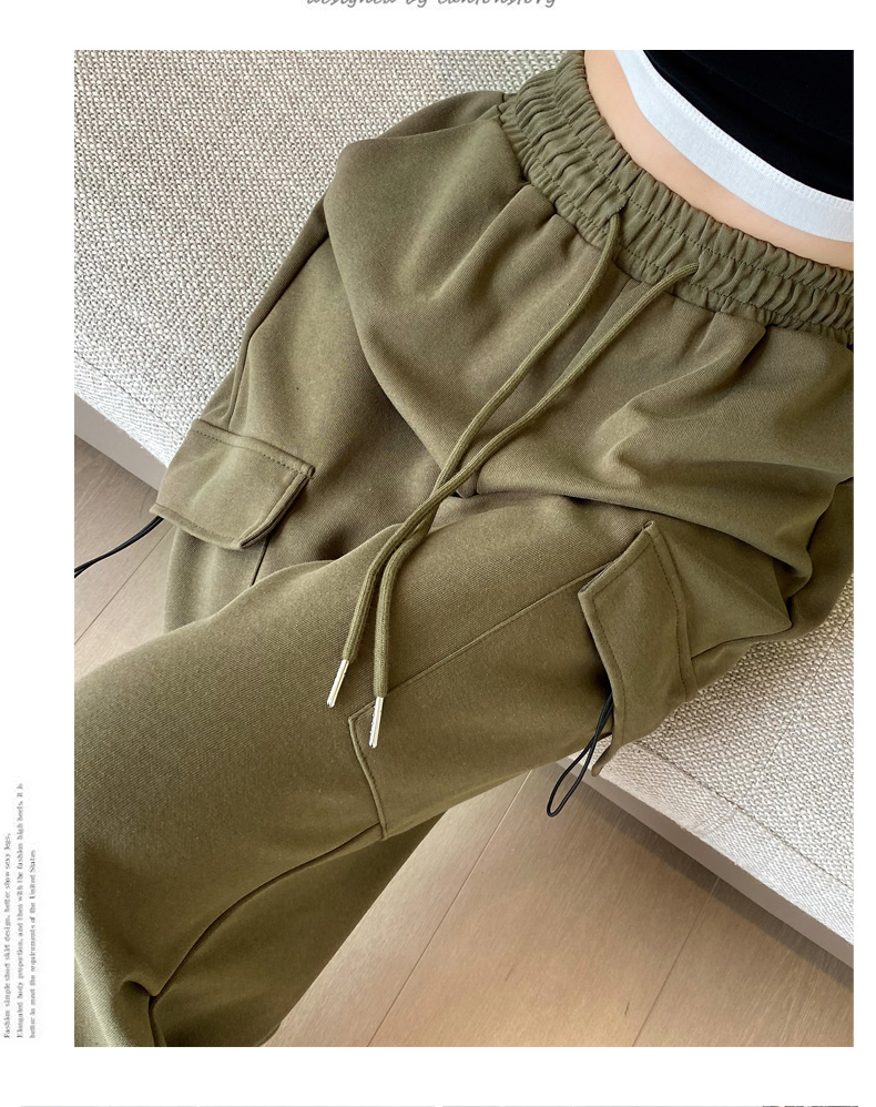 미국 스타일 기모 주의 바지 여성 가을 및 겨울 높은 허리 스트랩 Dagging 스트레이트 다리 넓은 다리 바지 작은 캐주얼 스포츠 바지스토어 가기