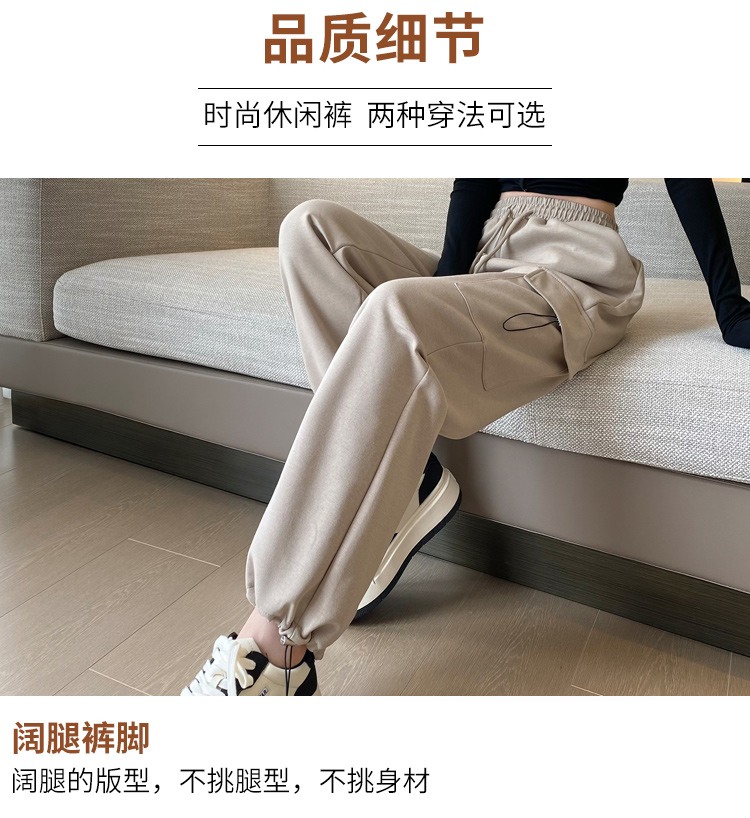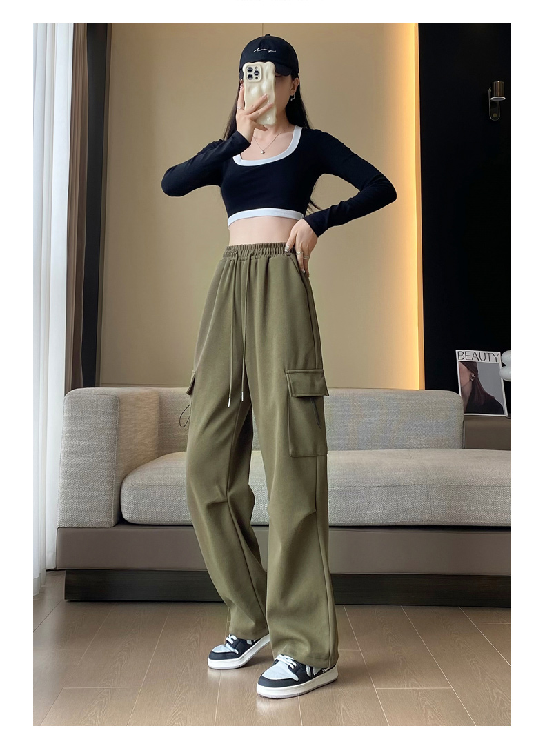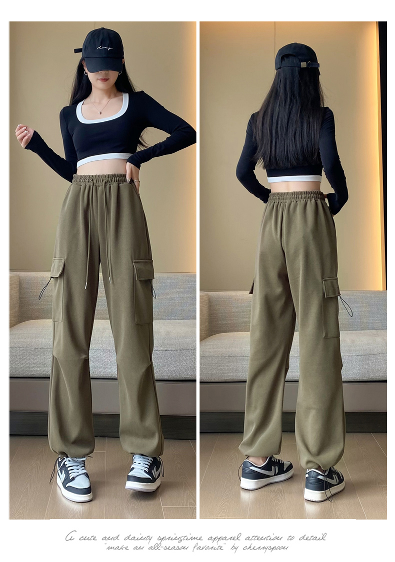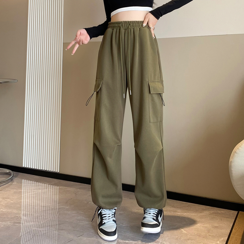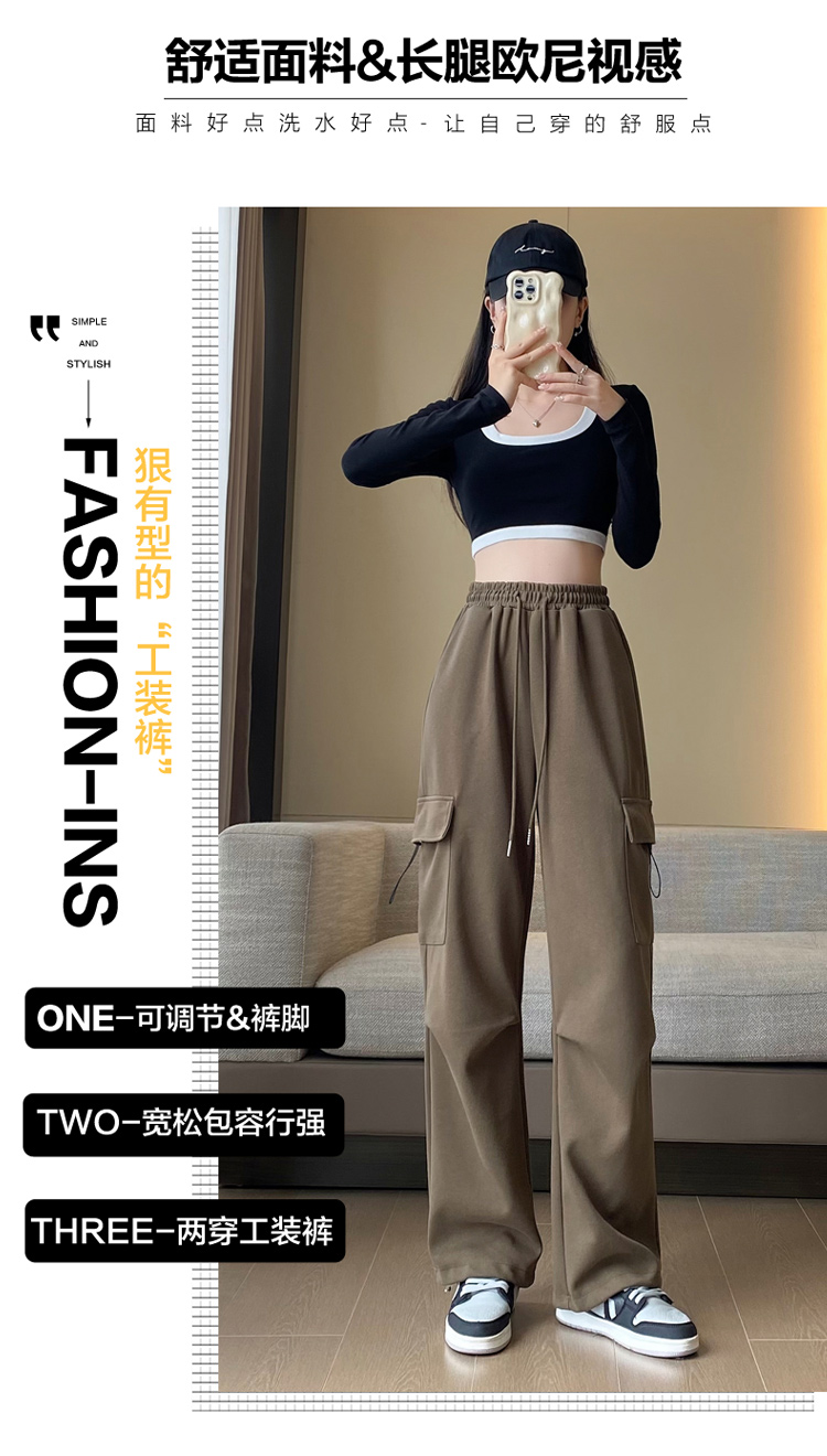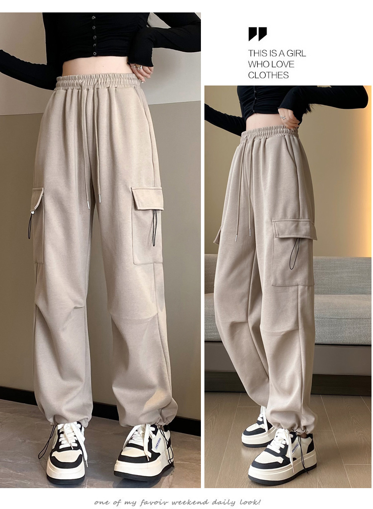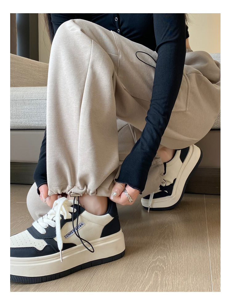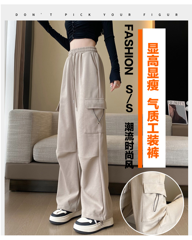미국 스타일 기모 주의 바지 여성 가을 및 겨울 높은 허리 스트랩 Dagging 스트레이트 다리 넓은 다리 바지 작은 캐주얼 스포츠 바지스토어 가기