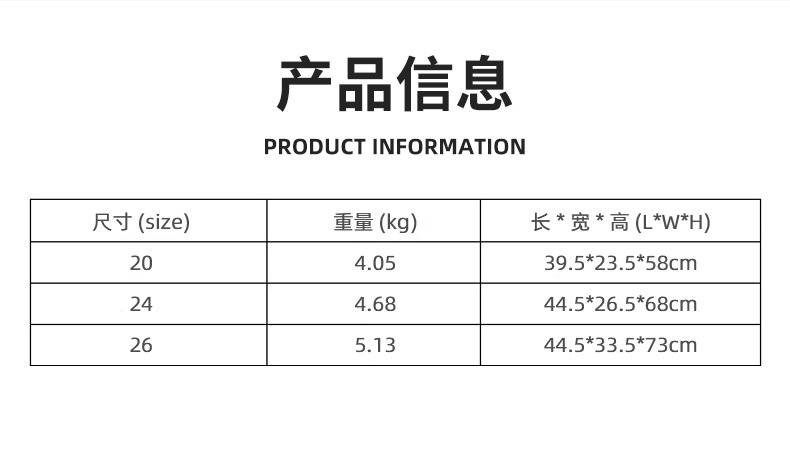 尺寸 20寸:39.5*23.5*58cm 净重4.05KG