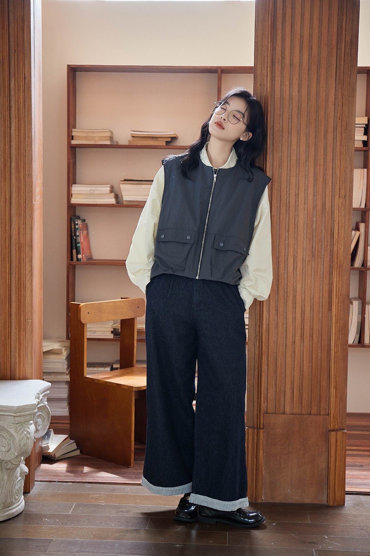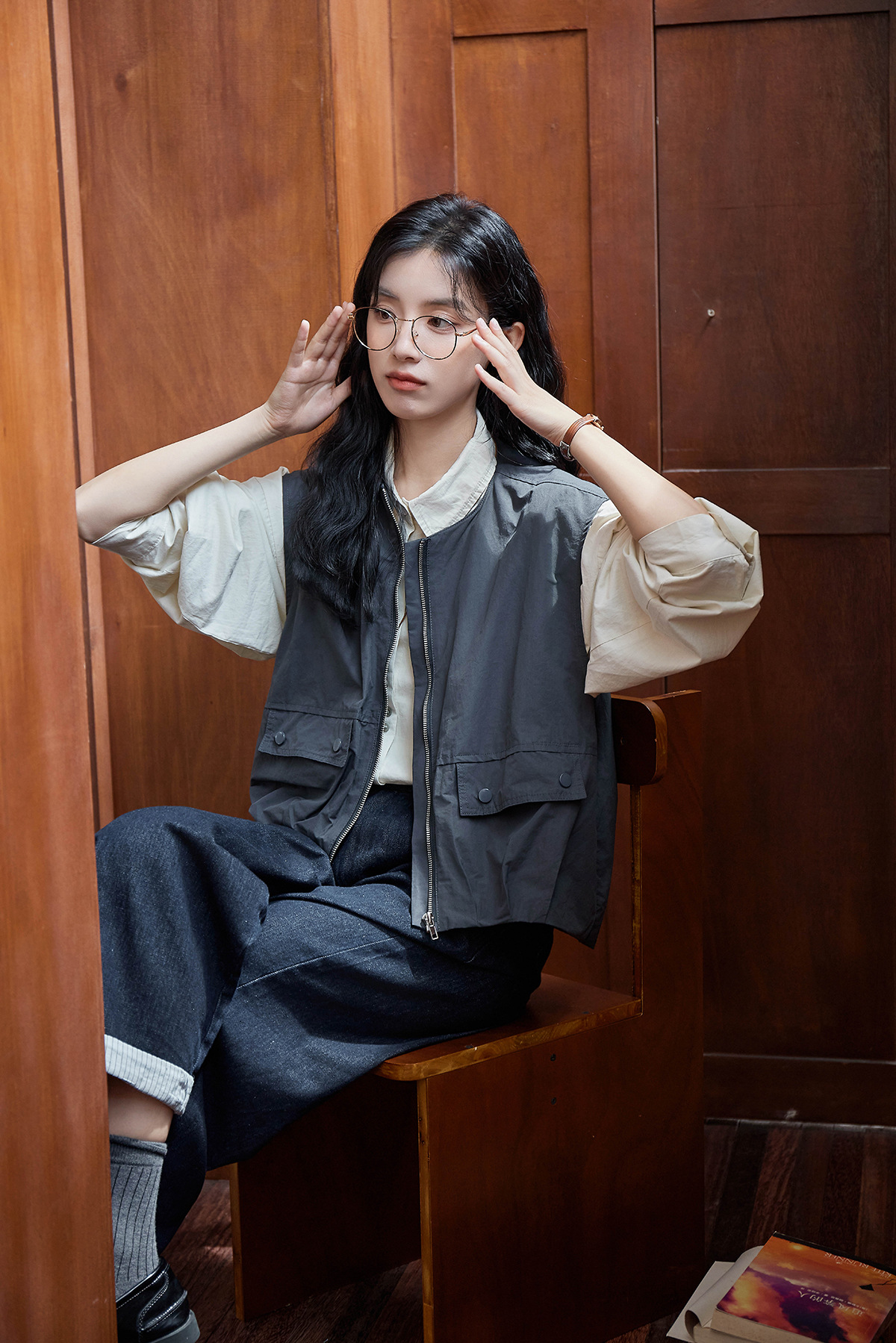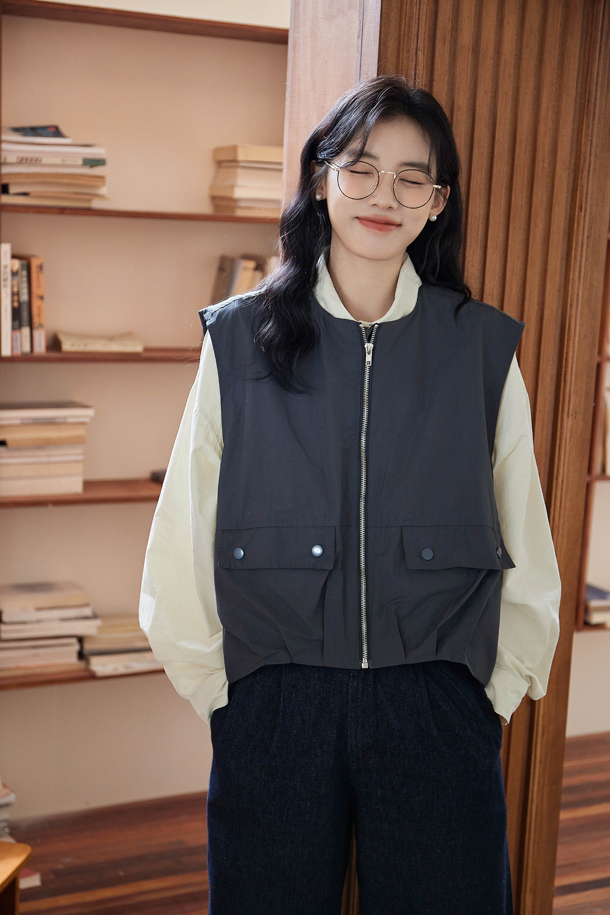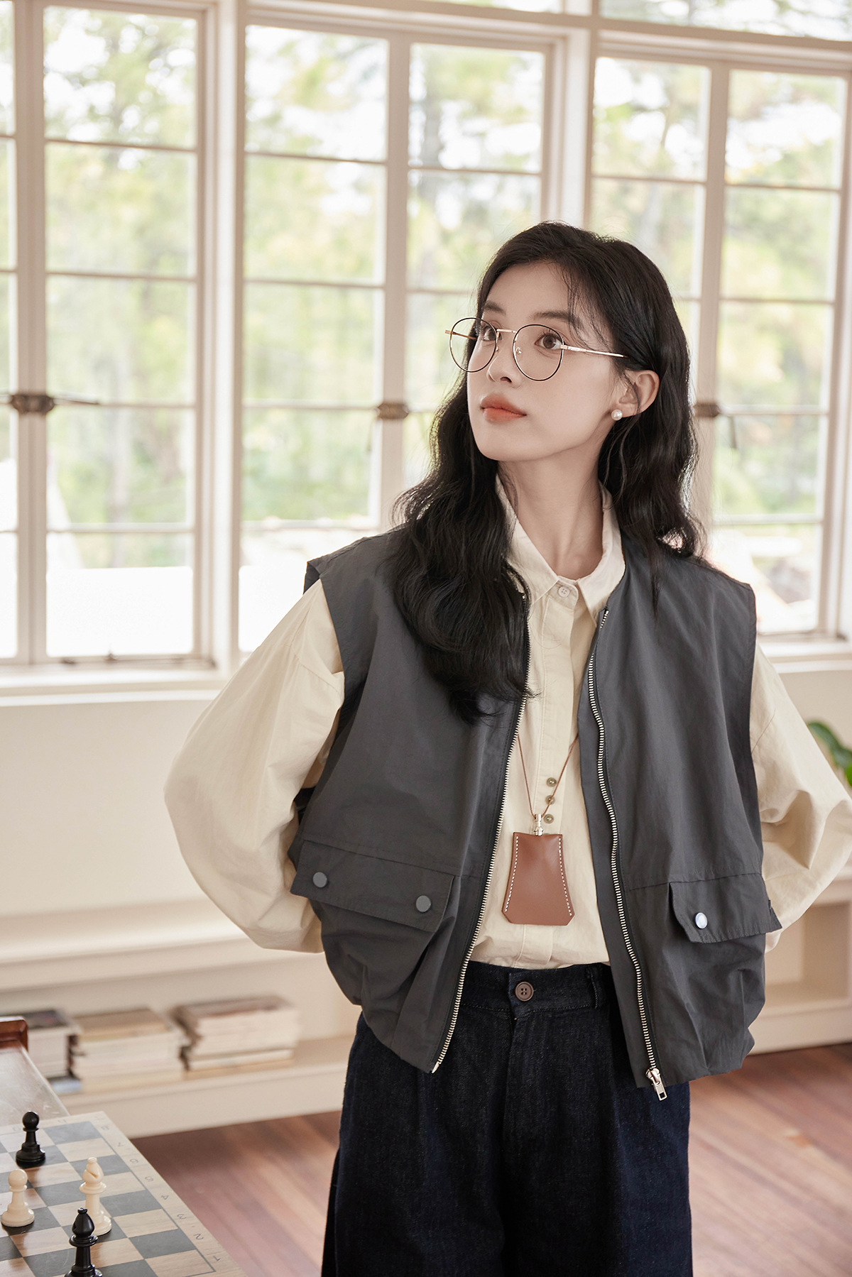 2024 가을과 겨울 새로운 일본 스타일 간단한 포켓 지퍼 조끼 여성 한국 스타일 민소매 쌓인 작업복스토어 가기