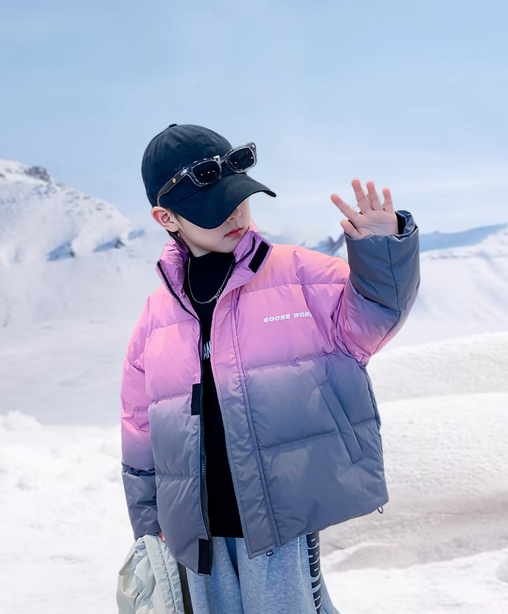 남학생 겨울 의류 그라디언트 2024 새로운 어린이 다운 재킷 덕 다운 중형 및 대형 소년 두꺼운 프라이드 스트리트 윈터 코트