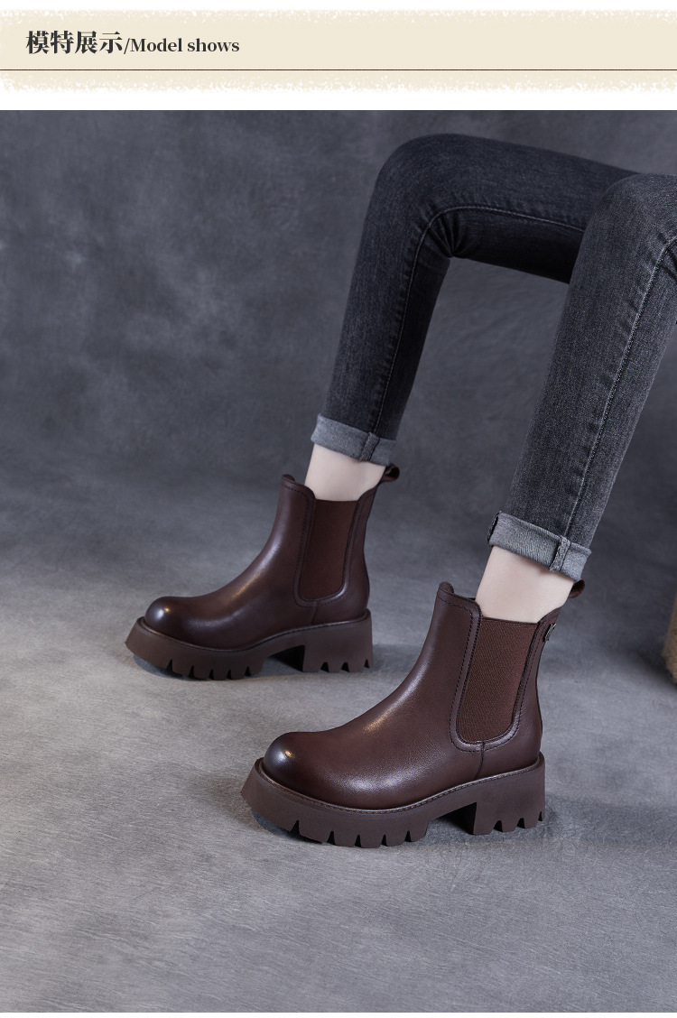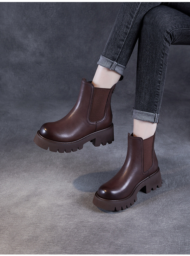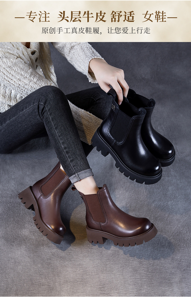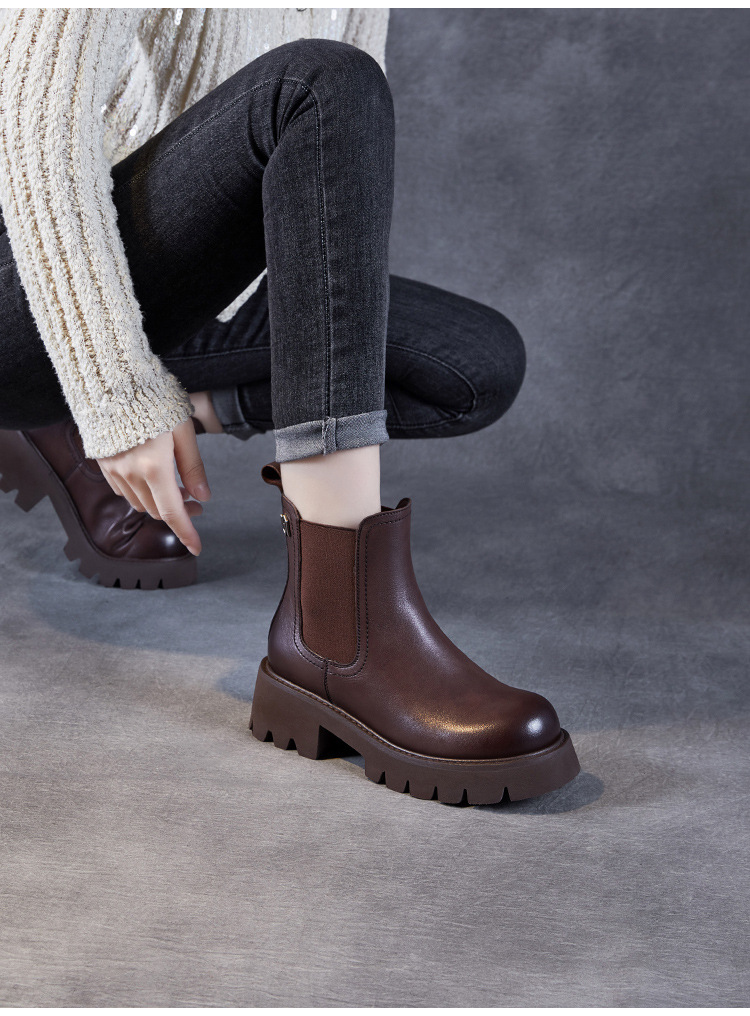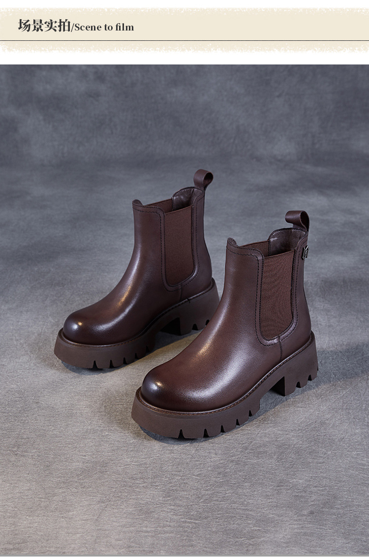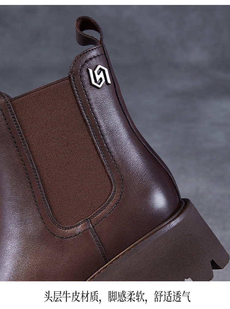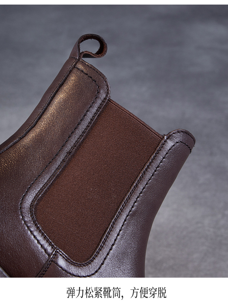 Top Layer Cowhide Chelsea 부츠 여성 두꺼운 힐 발목 부츠 2024 가을 및 겨울 두꺼운 기모 연기 부츠 다크 브라운 Martin 부츠스토어 가기