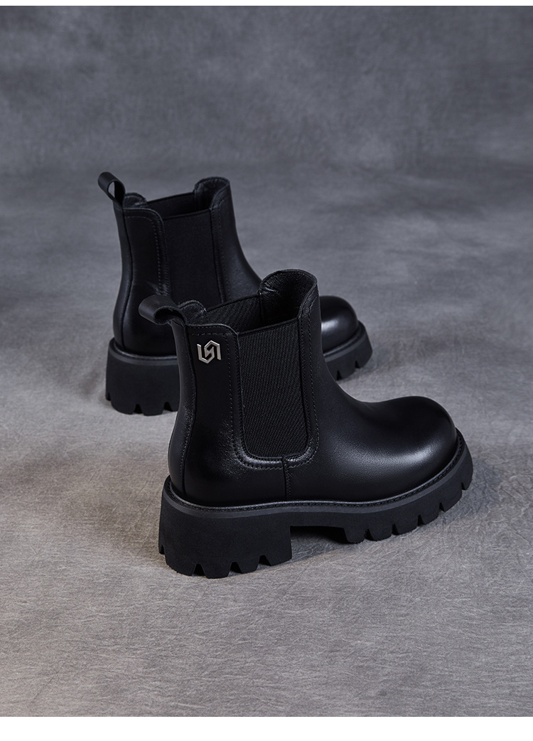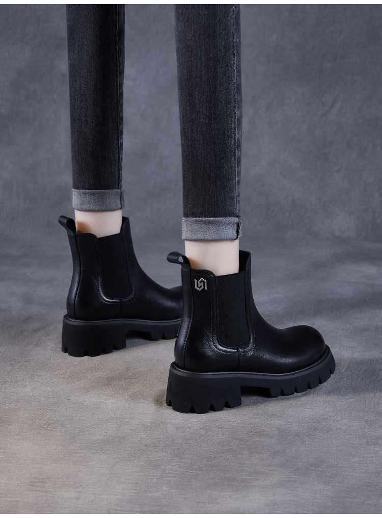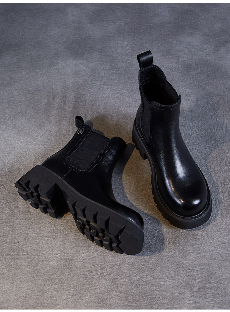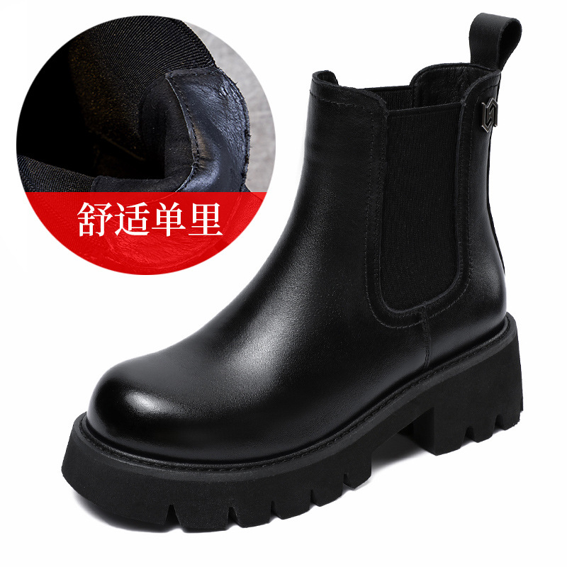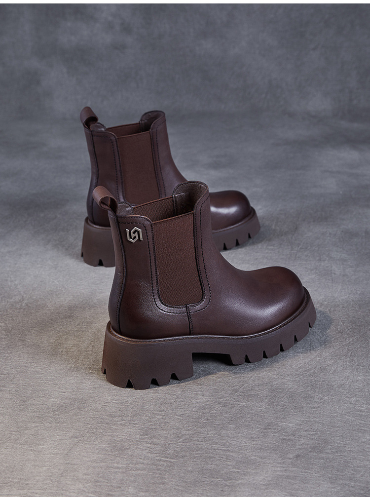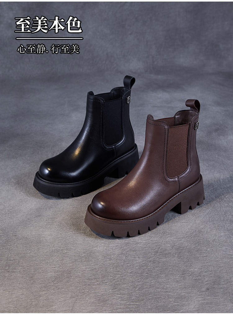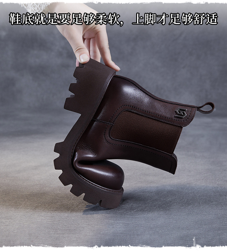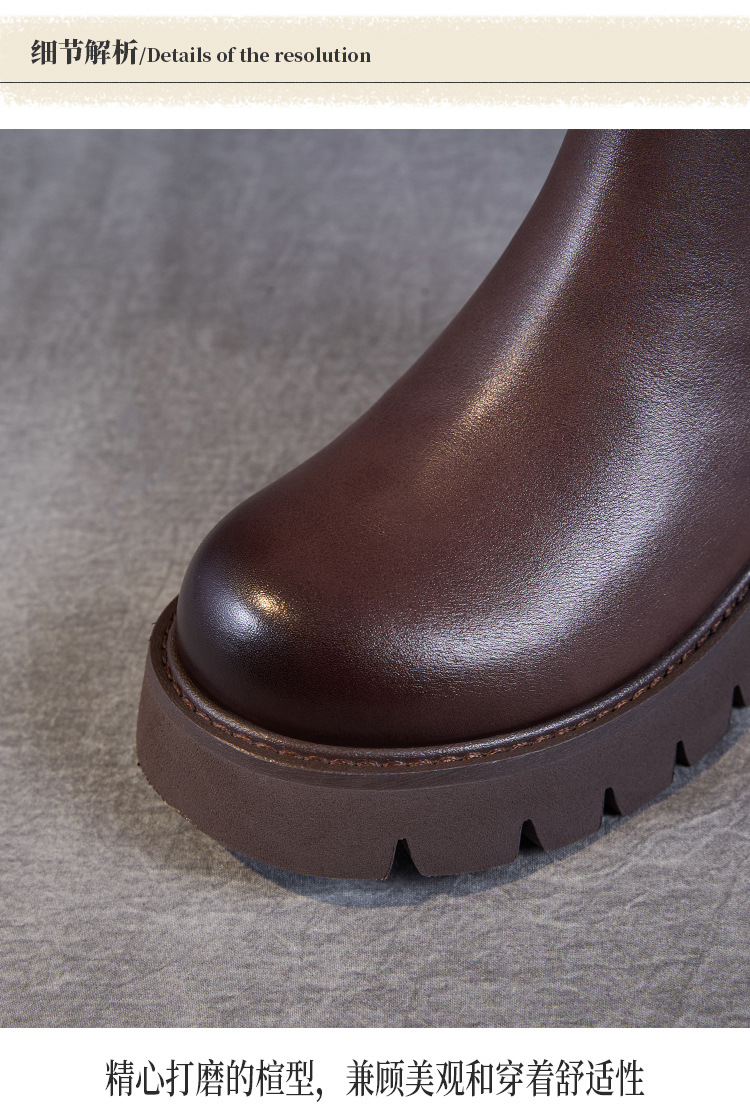 Top Layer Cowhide Chelsea 부츠 여성 두꺼운 힐 발목 부츠 2024 가을 및 겨울 두꺼운 기모 연기 부츠 다크 브라운 Martin 부츠스토어 가기