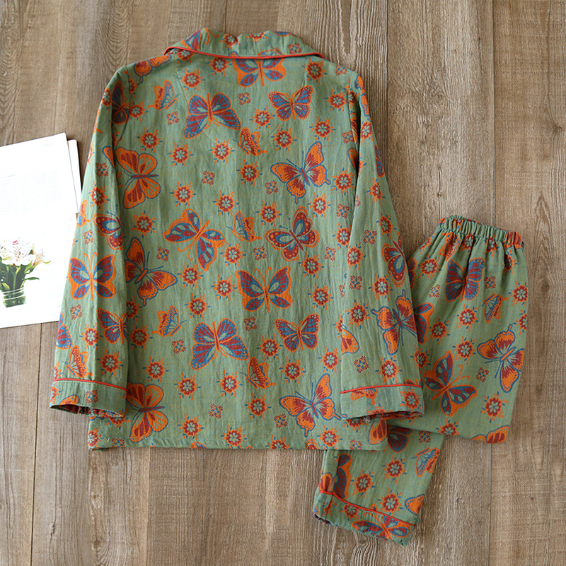 빈티지 민족 스타일 잠옷 여성 봄과 가을 여름 얇은 긴 소매 원사 염색 자카드 퓨어 코튼 캐주얼 홈 의류 세트