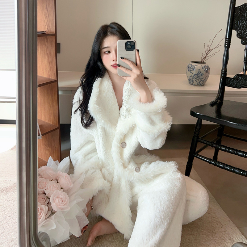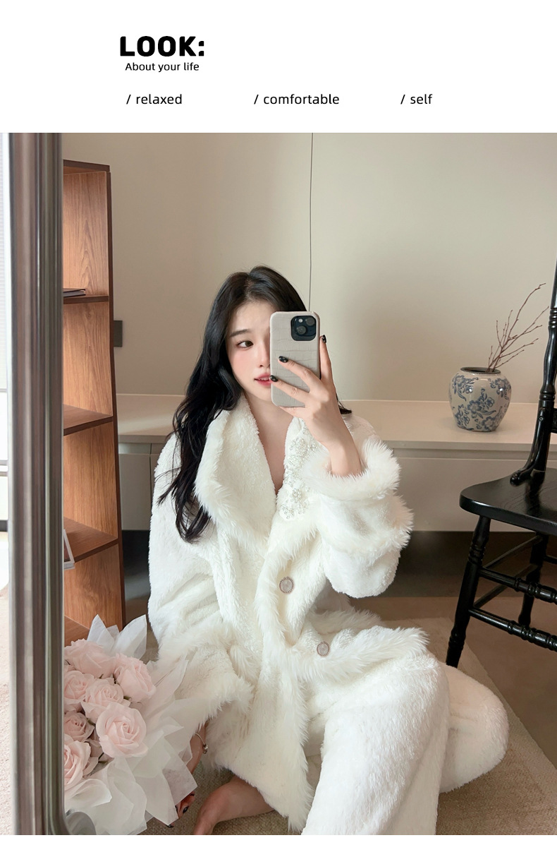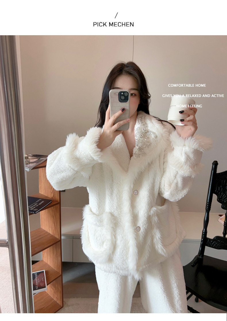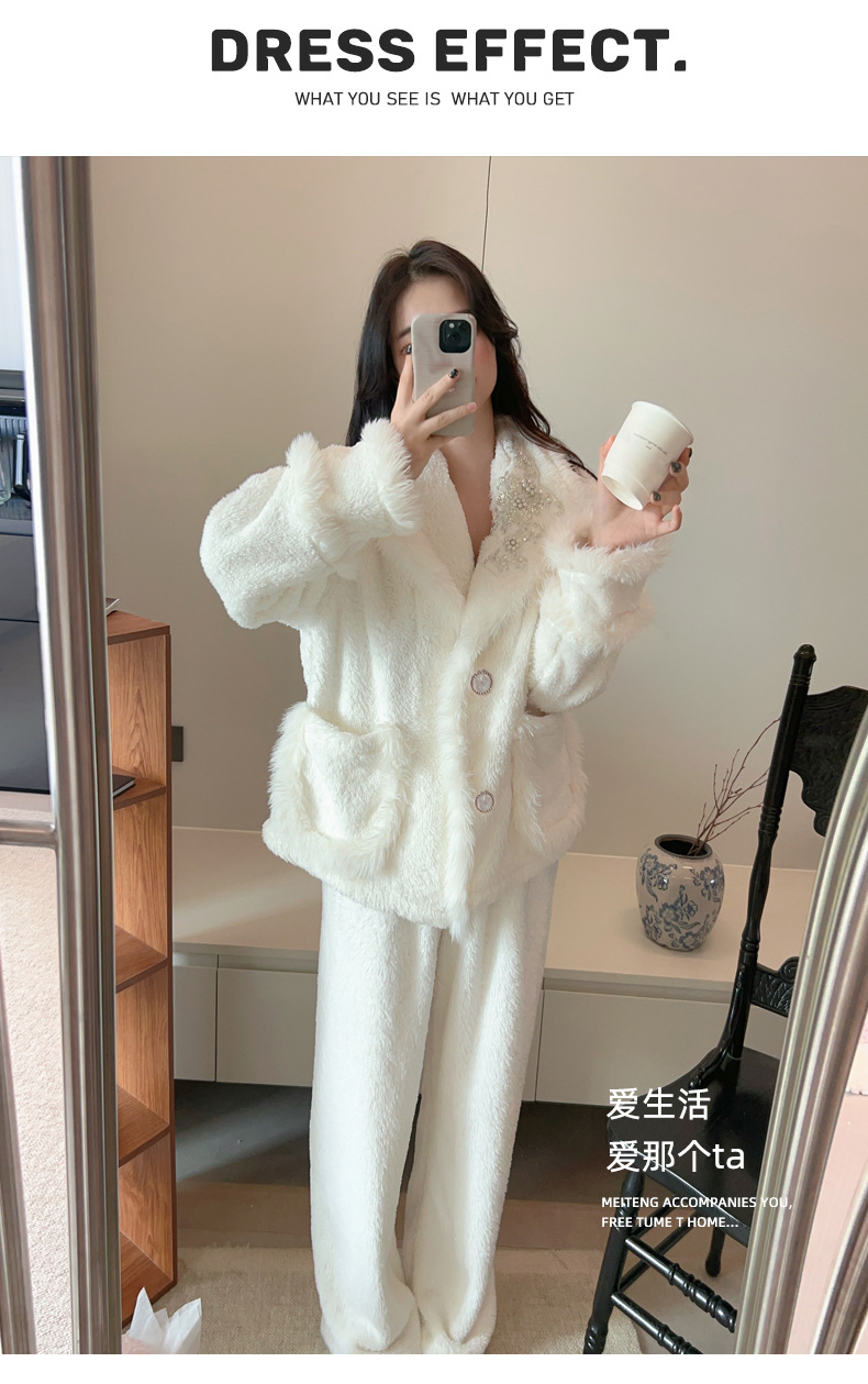 2024 새로운 산호 양털 잠옷 겨울 여성 국가 스타일 간단한 두꺼운 플란넬 가을과 겨울 홈 의류 세트