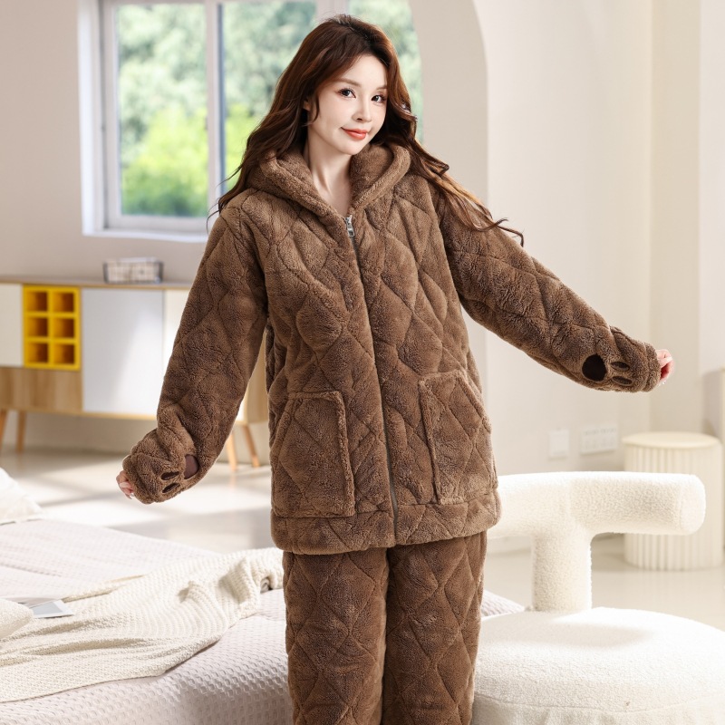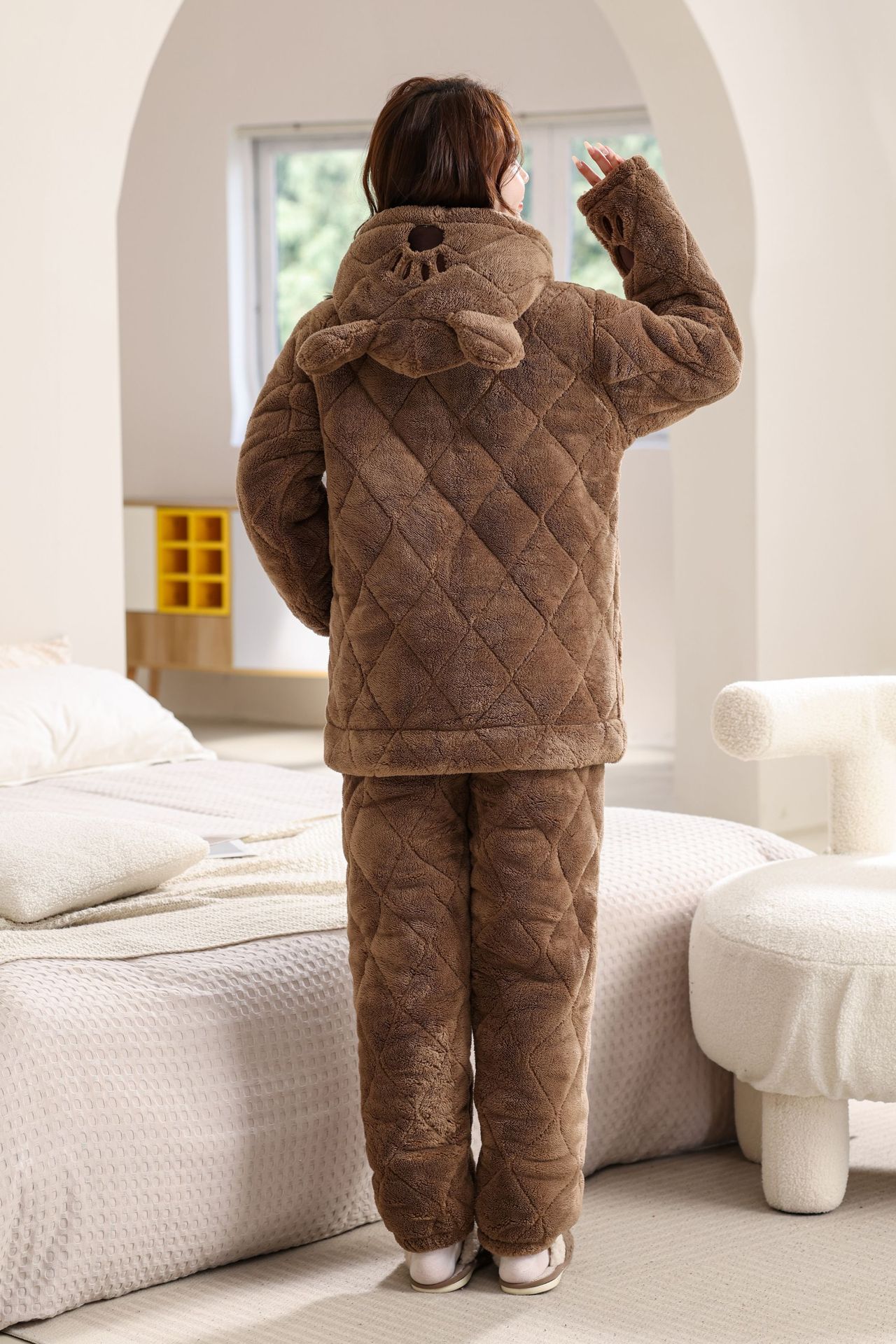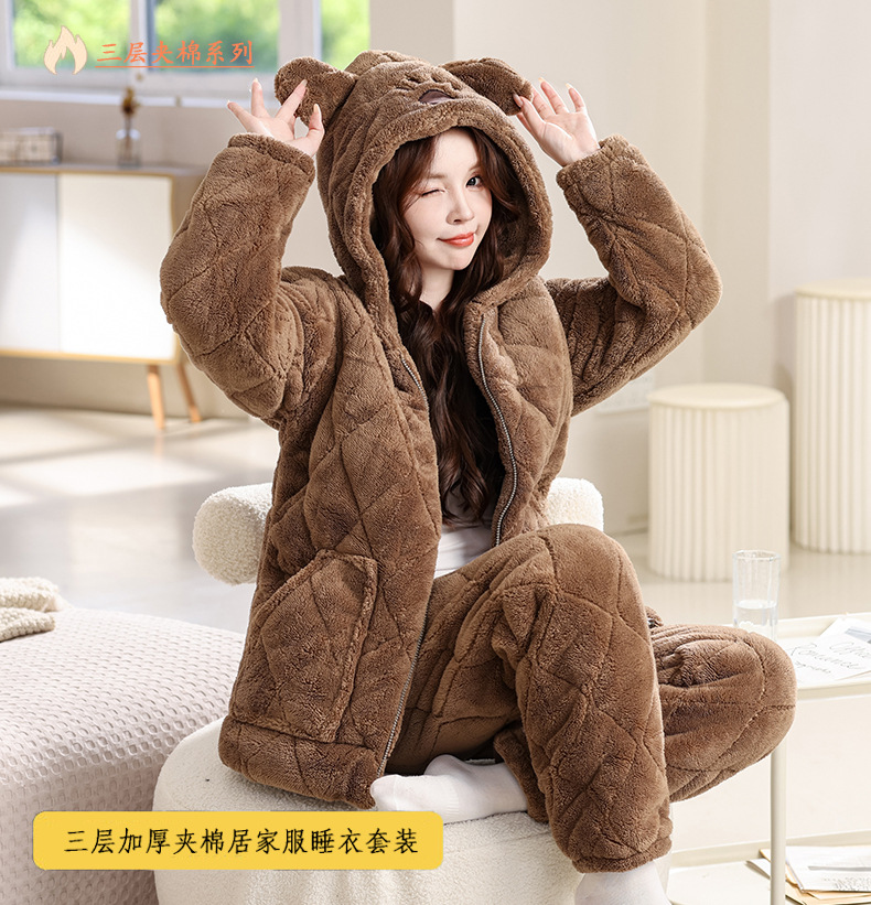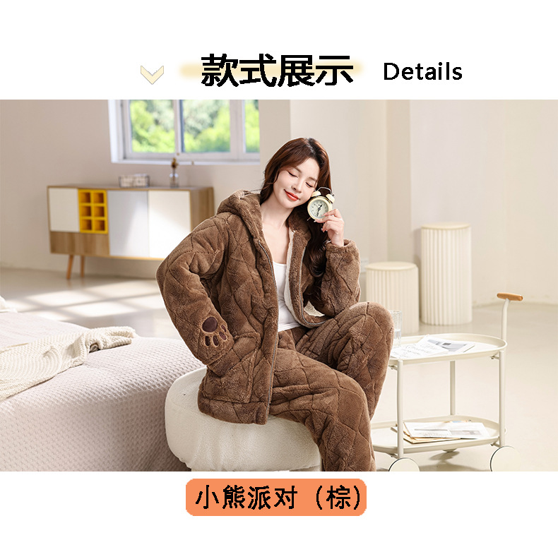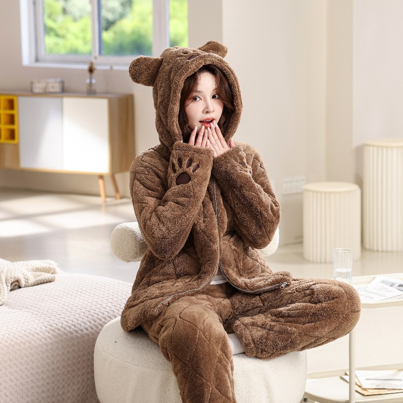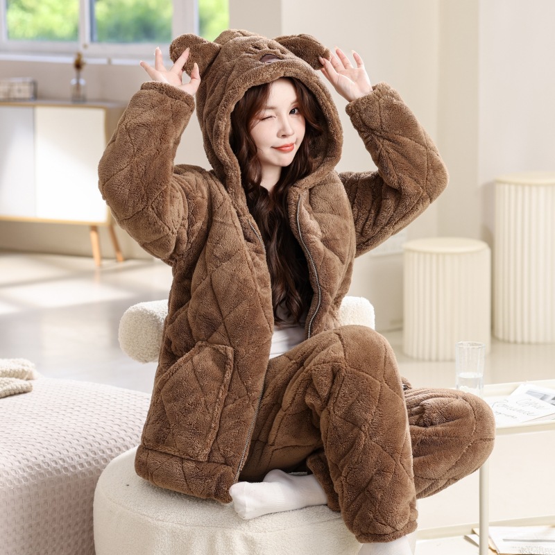 2024 년 잠옷 여성의 겨울 사랑 곰 지퍼 후드 산호 양털 두꺼운 겉옷 겨울 홈 의류 세트