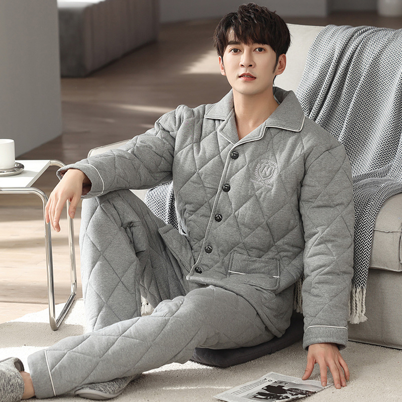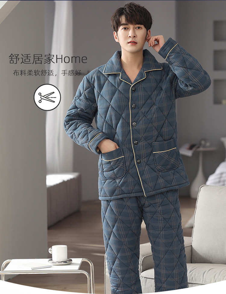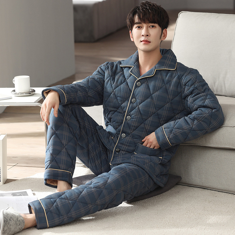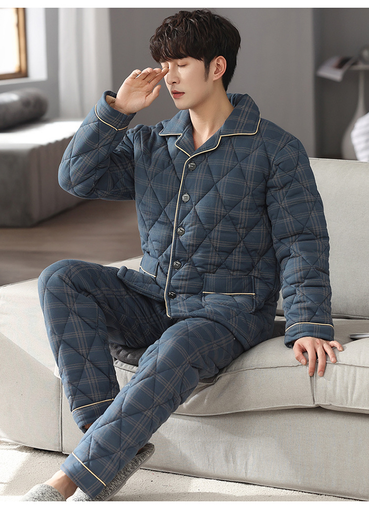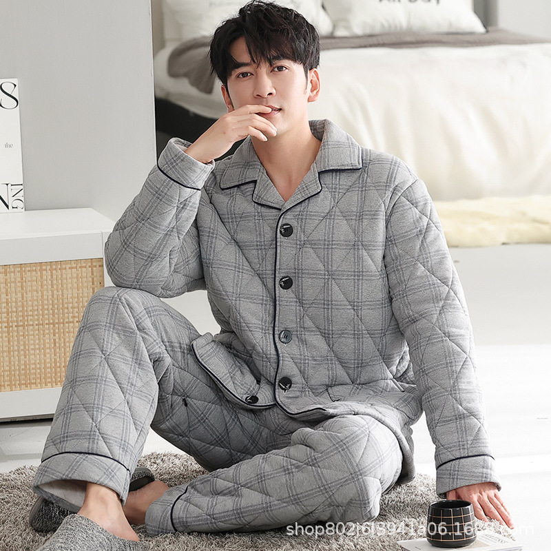 TikTok Generation 겨울 남자 3 층 두꺼운 니트 퀼트 격자 잠옷 플러스 사이즈 면화 자켓 홈 의류 세트 남성