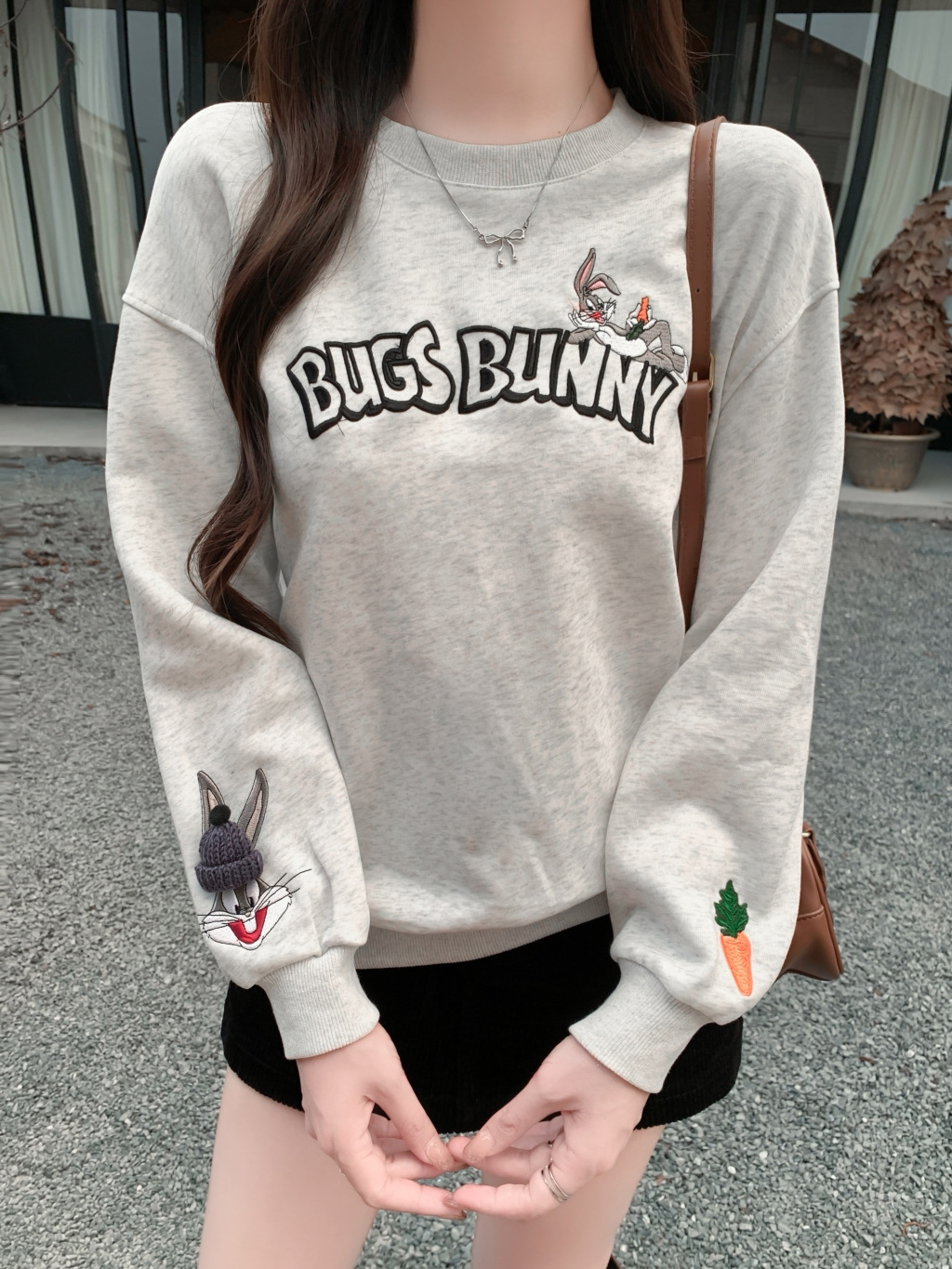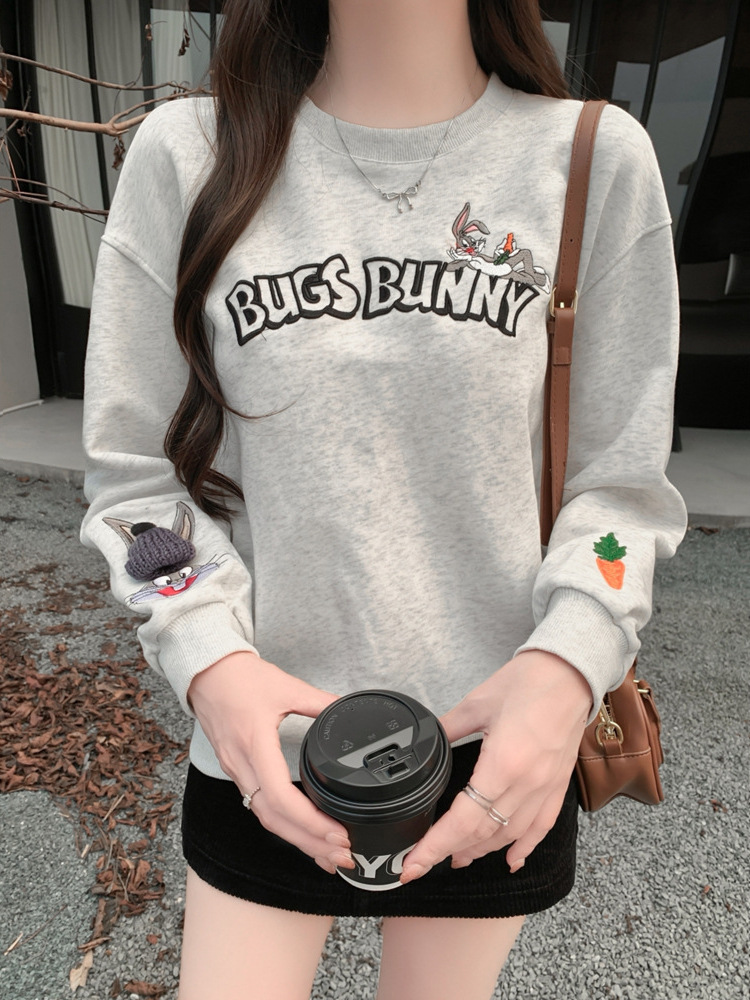 회색 자수 3 차원 장식 둥근 목 땀 여성의 가을과 겨울 봄 서양식 레트로 느슨한 슈퍼 좋은 기모 탑스토어 가기