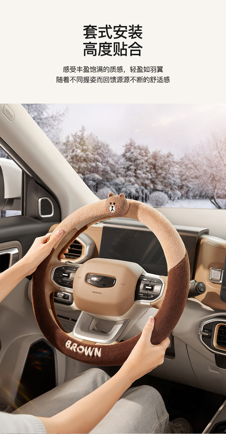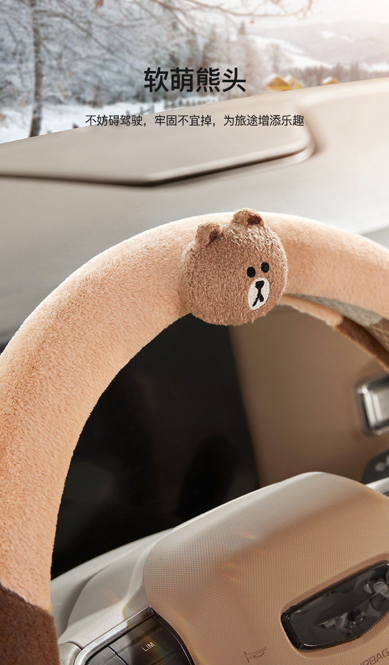 다크 브라운 곰 만화 자동차 사계절 보편적 인 겨울 봉제 스티어링 휠 커버 여성의 귀여운 봄 여름 가을 겨울 자동차 핸들 커버스토어 가기