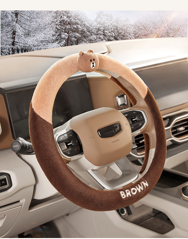 다크 브라운 곰 만화 자동차 사계절 보편적 인 겨울 봉제 스티어링 휠 커버 여성의 귀여운 봄 여름 가을 겨울 자동차 핸들 커버