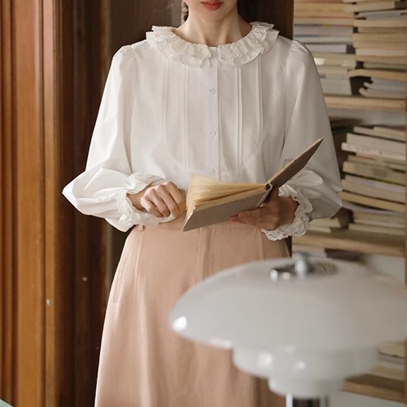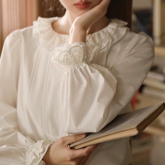 Nesoulum 화이트 더블 레이스 칼라 트리밍 셔츠 여성의 가을 프랑스 스타일 복고풍 느슨한 디자인 탑