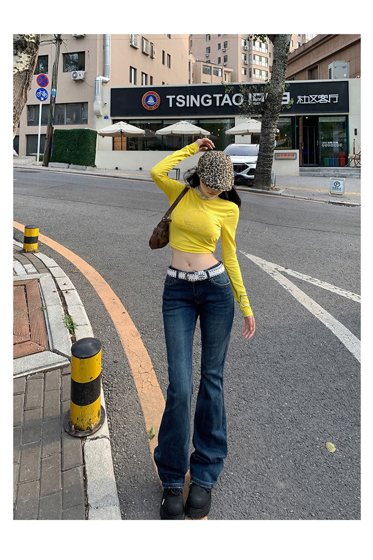 YC & 미국 레트로 낮은 허리 스파이스 소녀 플라 드 팬츠 슬림 핏 슬림 스트레치 청바지 여성의 가을과 겨울 및 긴 바지스토어 가기