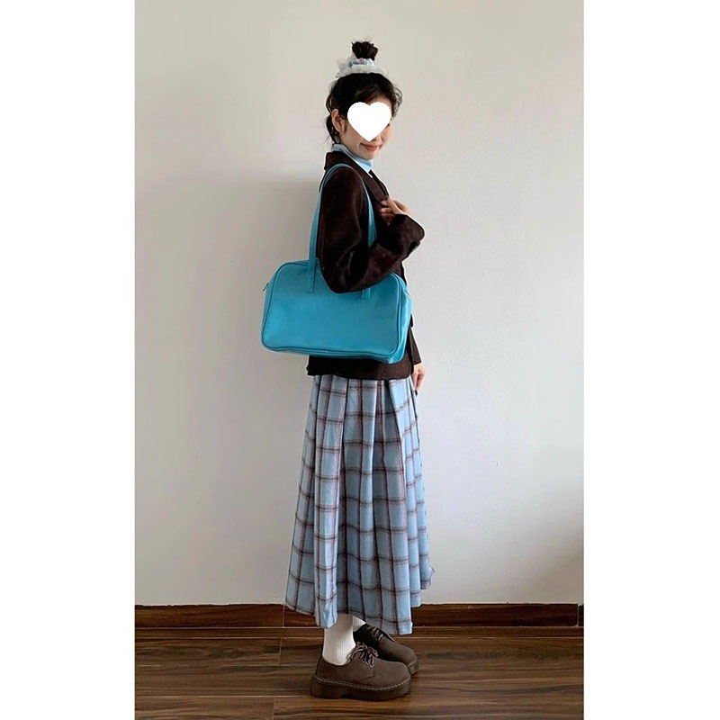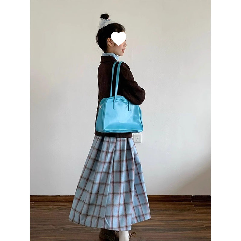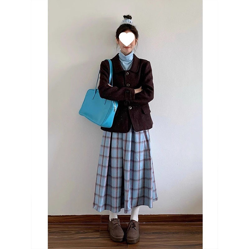 빈티지 패션 올 매치 블루 체크 무늬 기모 스커트 중간 길이 A 라인 스커트